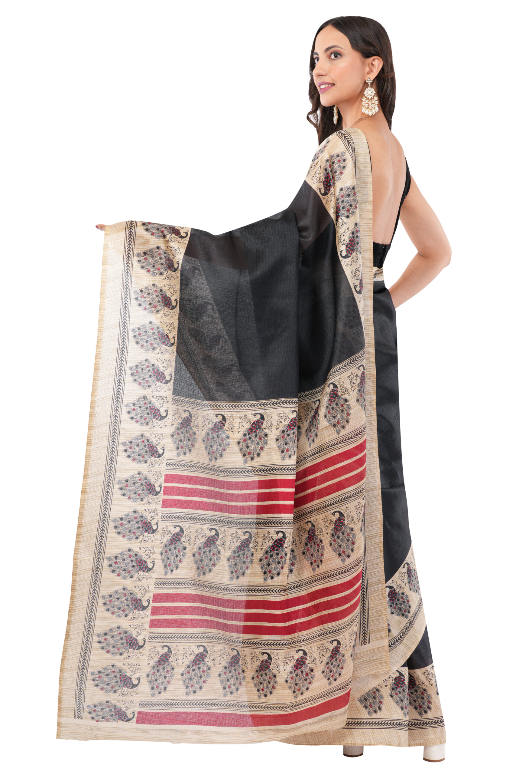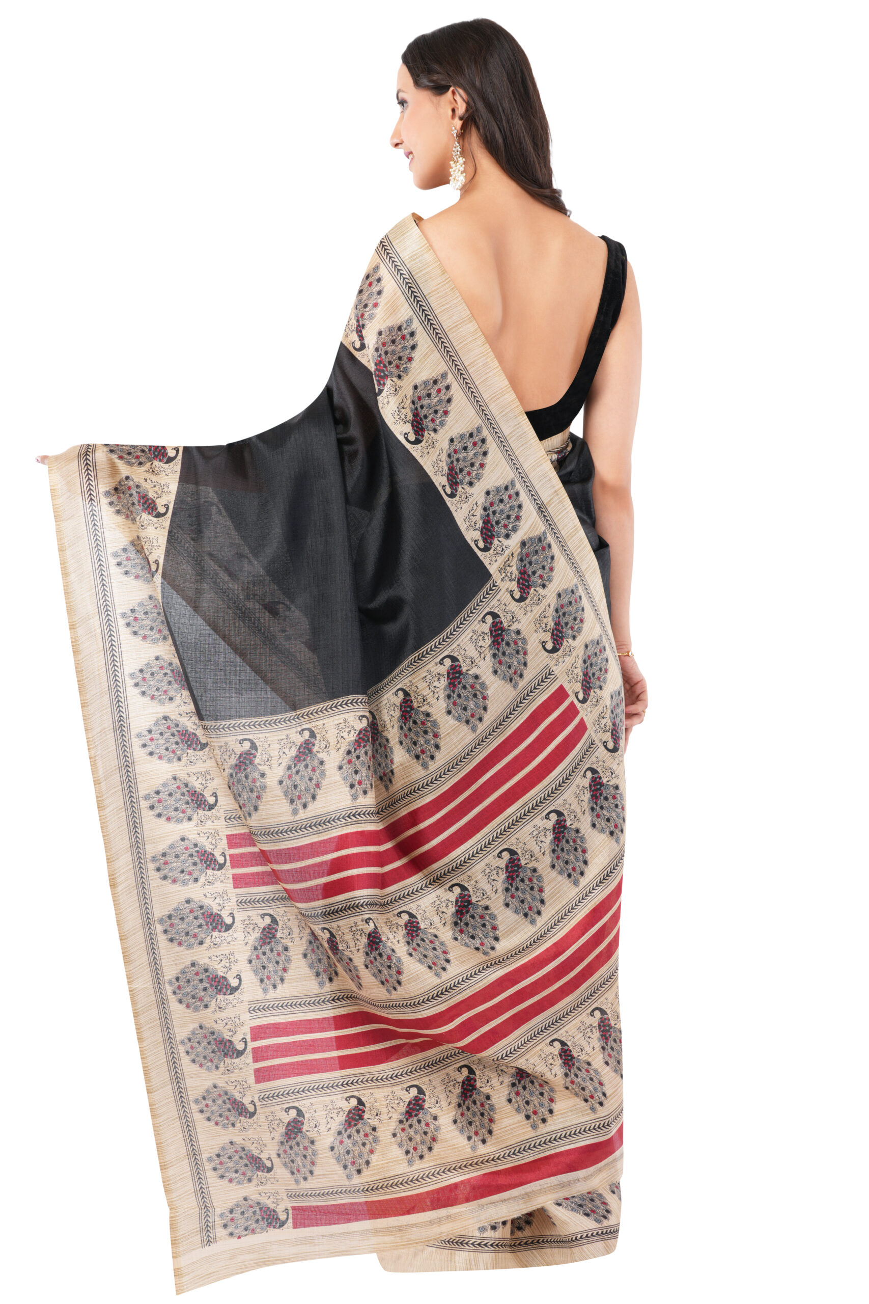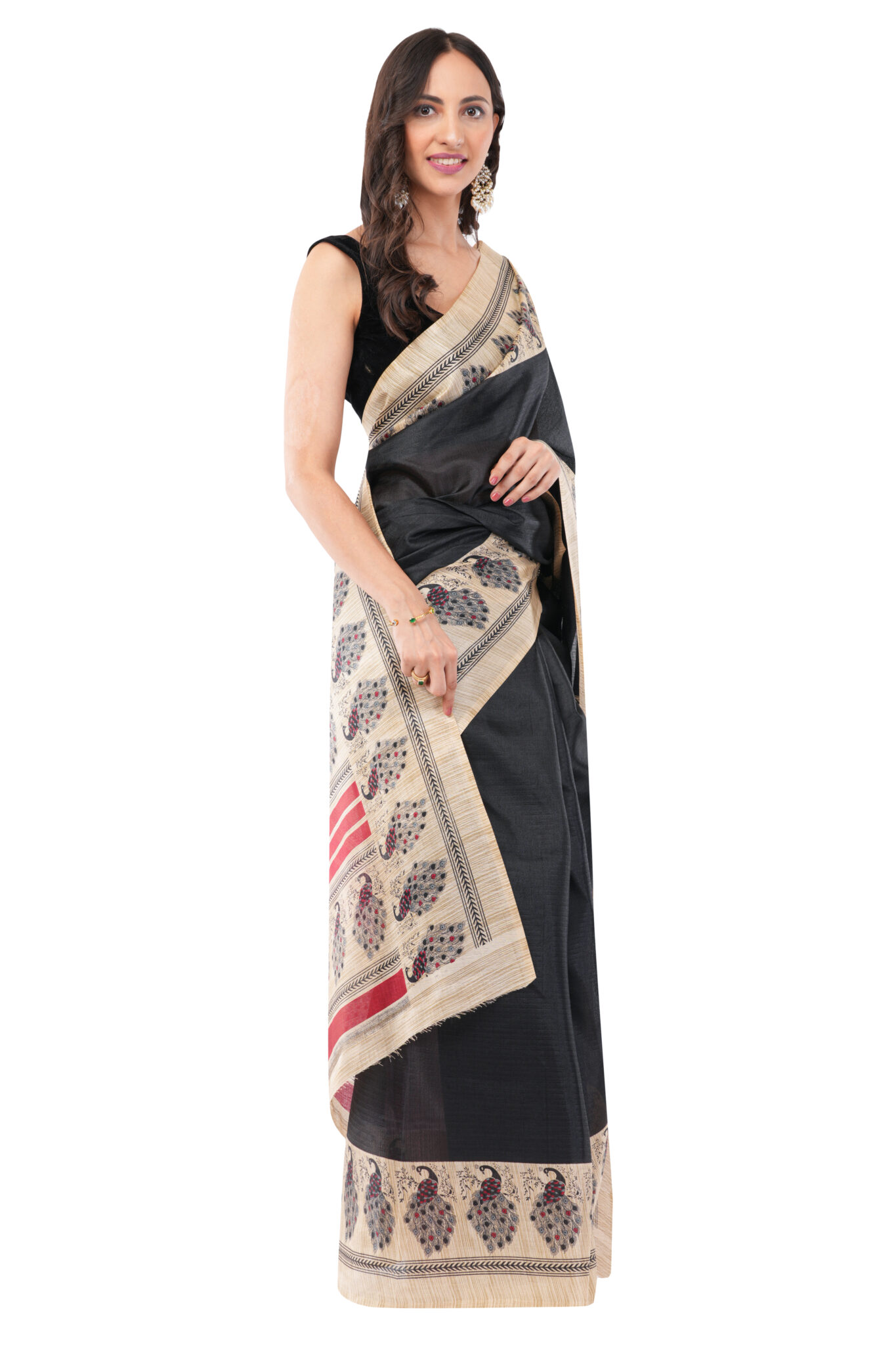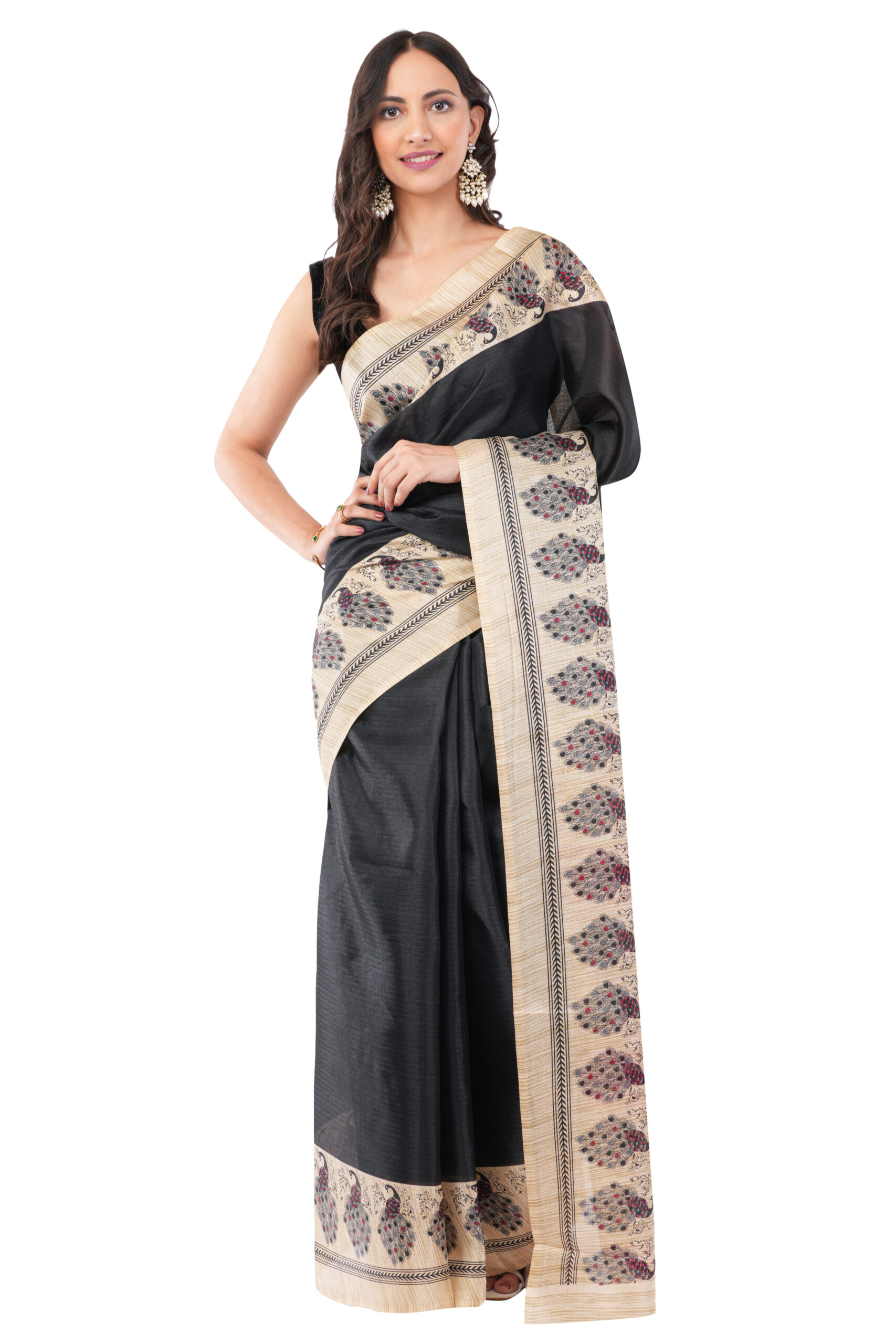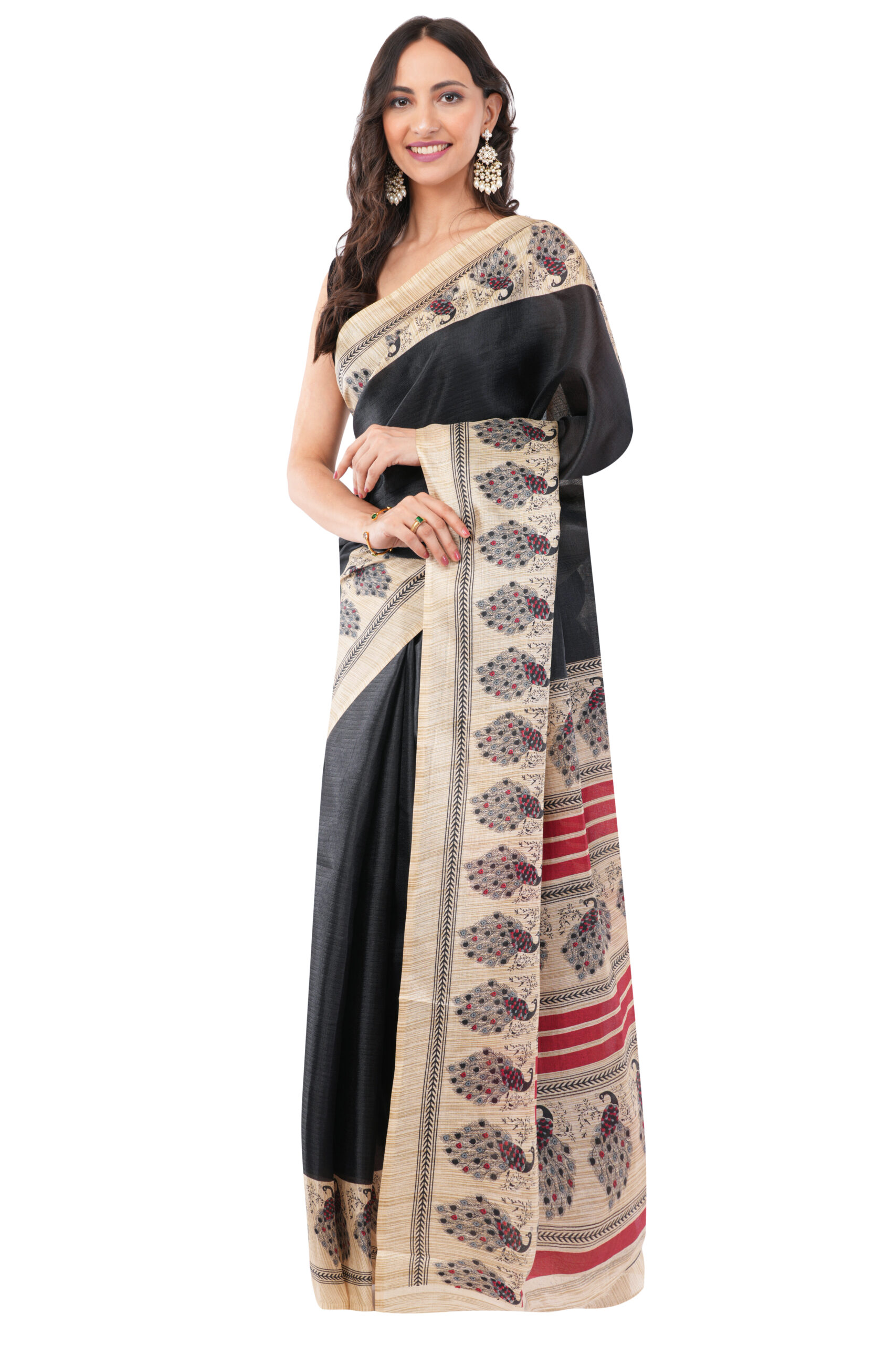 There are moments when you need armor disguised as art, when the boardroom demands presence that cannot be ignored, when your entrance must silence the room before you’ve spoken a word—this deep charcoal black saree with its commanding peacock-adorned borders is that weapon of elegant intimidation. The body unfolds in rich, luxurious black silk that catches light with subtle shifts between charcoal and deepest grey, creating depth without pattern, a purposeful void that makes the borders explode with even more dramatic impact. This isn’t delicate or shy—the wide cream borders running along both edges are densely populated with regal peacock motifs in purple, burgundy, teal, and coral, each bird rendered in intricate detail with their magnificent plumage spread wide, the repetition creating an almost hypnotic visual rhythm. The black chevron borders add graphic precision between the peacocks and the body, their geometric sharpness contrasting beautifully with the organic curves of the birds. Then the pallu unveils its masterstroke—alternating horizontal bands of crimson-pink stripes interrupt the peacock procession, creating bold color blocks that transition from the cream peacock sections to pure visual drama, while the borders continue their peacock parade around every edge, ensuring no angle goes unnoticed. This is statement dressing at its most sophisticated—the black body provides gravitas and authority, while the elaborate borders prove you understand artistry and heritage aren’t compromises to power but amplifications of it. The bamboo-silk blend here is engineered for high-stakes moments—bamboo’s natural breathability prevents the nervousness sweats during critical presentations, its anti-static properties ensure the drape stays flawless even after hours of sitting through marathon meetings, while its shape-retention means the pleats you set in the morning still look sharp when you’re closing deals at sunset. The silk brings that executive sheen that photographs impeccably, whether for corporate headshots or being featured in business magazines, its substantial hand ensuring every drape falls with architectural intention rather than limp uncertainty, while the color-fastness means this black stays true-black rather than fading to grey with wear. This saree understands that some situations require you to be undeniable, unforgettable, utterly formidable—and it’s designed to make that as effortless as breathing while looking like you were born to lead.