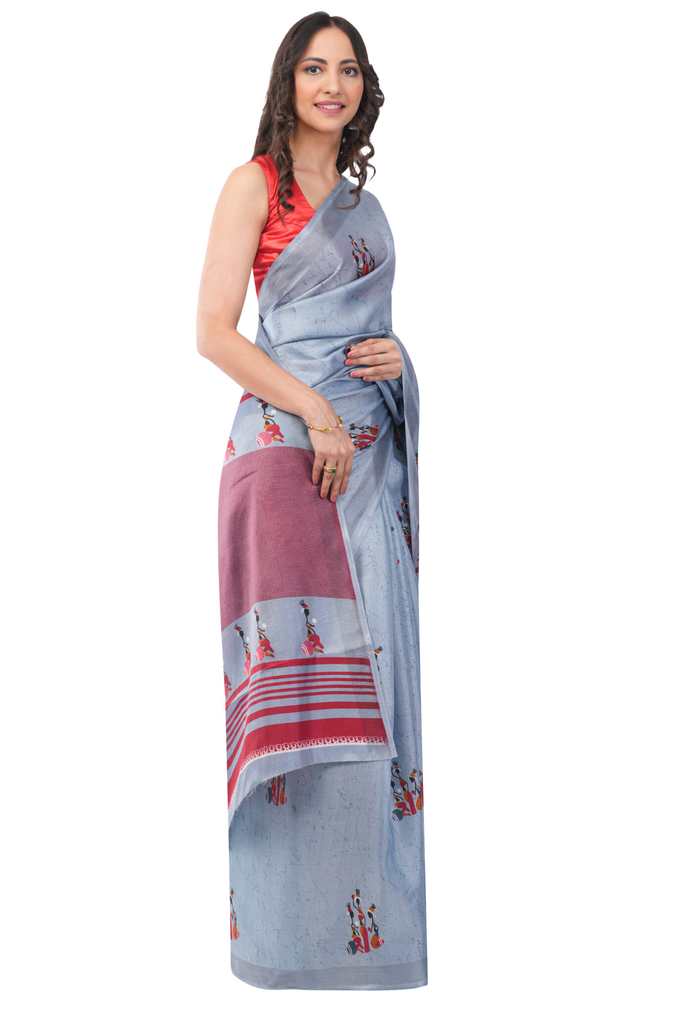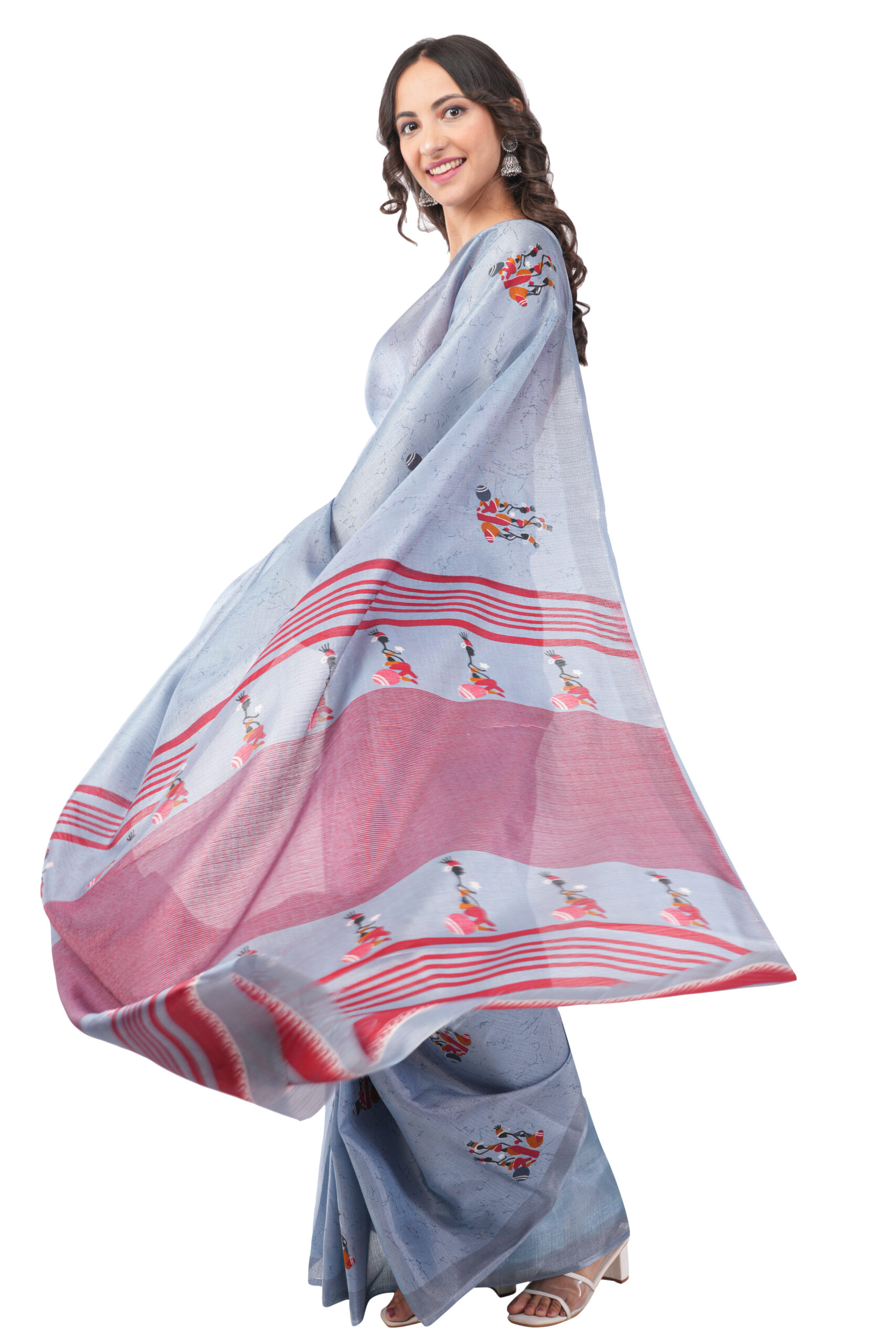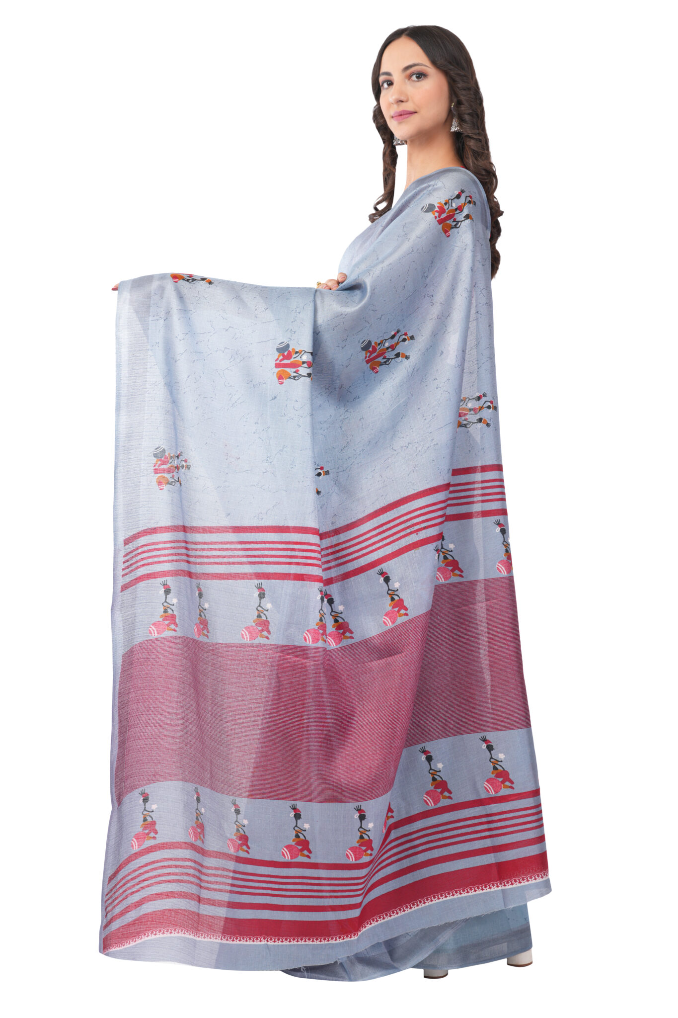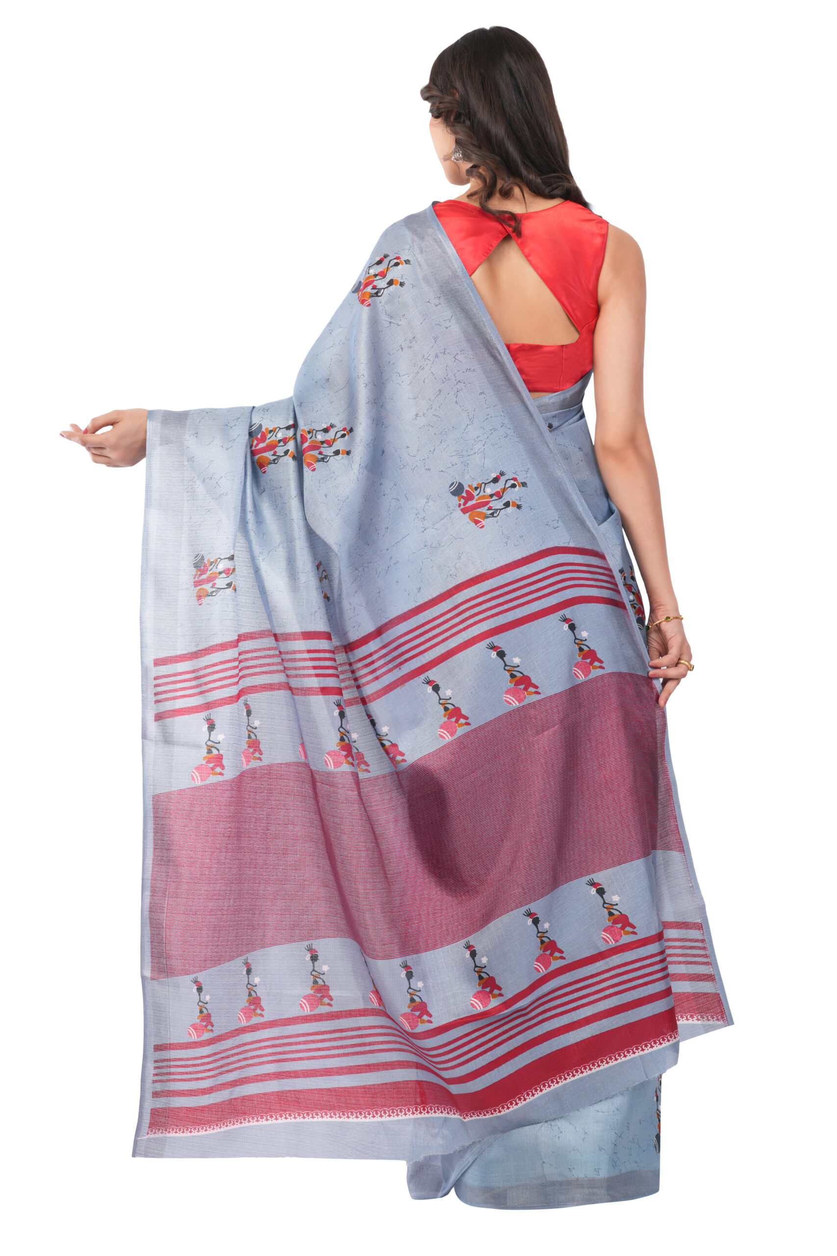 When the first rains kiss the parched earth of Khajuraho, tribal women emerge with earthen pots balanced gracefully atop their heads, walking in rhythmic unison toward the village well—this timeless ritual now dances across your drape in serene powder blue and crimson. The ethereal sky-blue body whispers of monsoon clouds, delicately scattered with vibrant red and coral tribal figures depicting the sacred water-carrying ceremony, each woman captured mid-stride with her kalash held high, a symbol of sustenance and sisterhood passed down through generations. Bold horizontal red stripes punctuate the fabric like ceremonial pathways, creating a striking rhythm that leads the eye to the magnificent pallu—a textured rose-pink expanse woven in subtle ribbed patterns that feel like gentle rain on fingertips, bordered above and below by those same dancing water carriers marching in perfect formation. The intricate borders feature delicate red stripes that frame this masterpiece, while the bamboo-silk blend works its magic on your skin—breathable enough for humid summer days yet elegant for air-conditioned offices, naturally temperature-regulating so you transition effortlessly from outdoor events to indoor gatherings, and so feather-light you’ll forget you’re wearing six yards of art. The silk’s lustrous finish catches light like water droplets at dawn, while bamboo’s inherent UV-resistant and odor-neutralizing properties keep you protected and confident through your longest days. This saree speaks to the woman who understands that true elegance lies in purposeful simplicity, who carries her heritage with the same grace as those Khajuraho water bearers, and who knows that sometimes the most powerful statement is made in whispers of blue and rose.