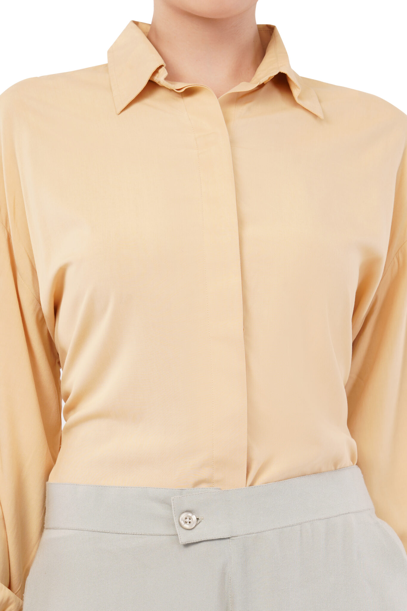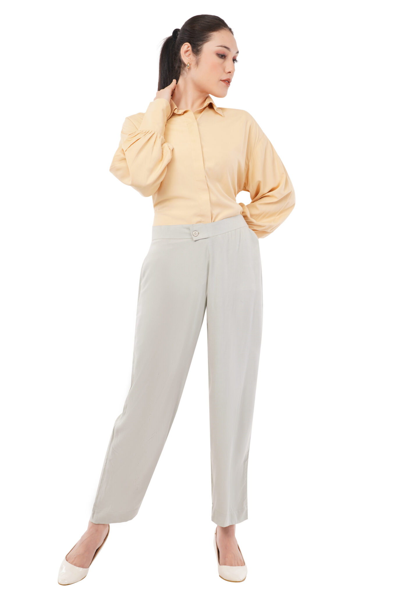 Sunset hues for the woman who makes every hour golden. Our cream bamboo blouse with gathered sleeves brings a soft radiance to your complexion, naturally enhanced by bamboo’s ability to regulate body temperature and prevent skin irritation. The crisp grey trousers ground the look in sophistication. Perfect for creative industries where personality is currency, yet polished enough for traditional corporate environments.