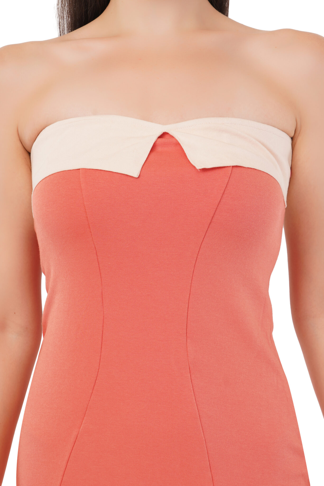 Geometry of grace. Coral strapless dress with cream scalloped yoke—architectural detail creating wave pattern at the bustline. The scallop edge offers unexpected softness on otherwise structured form, body-conscious fit celebrating silhouette without apology. Knee-length confidence, strapless construction that stays precisely placed.