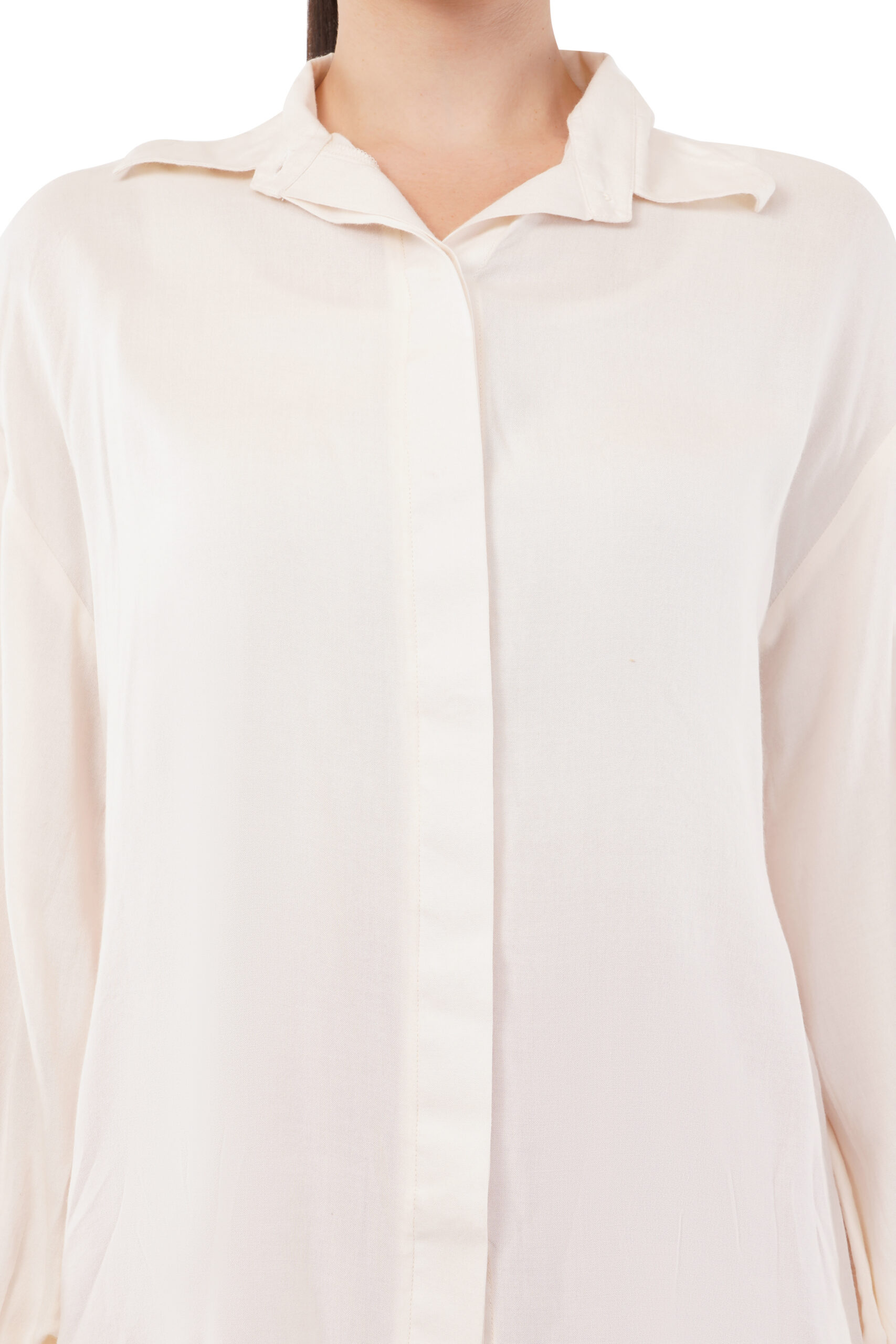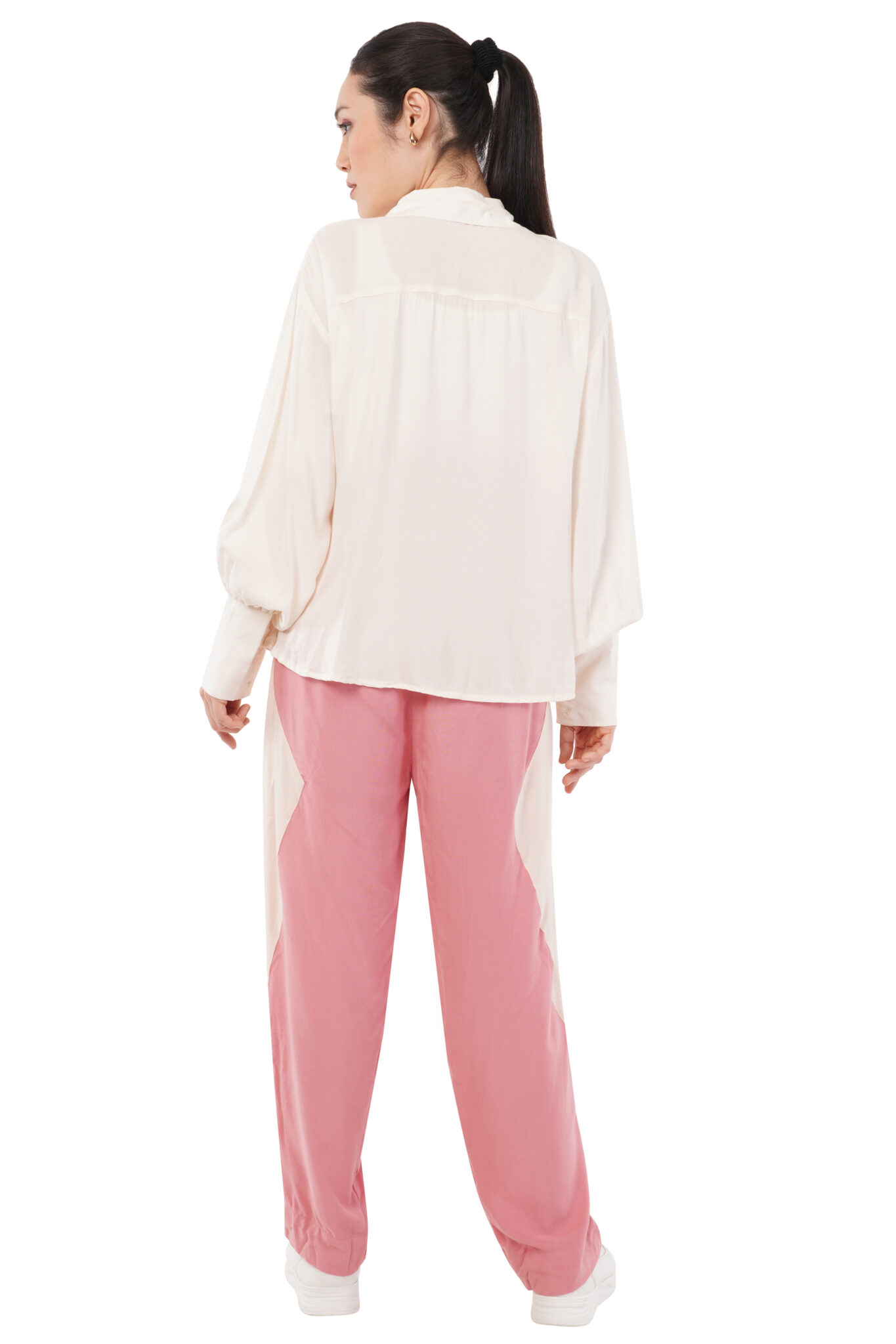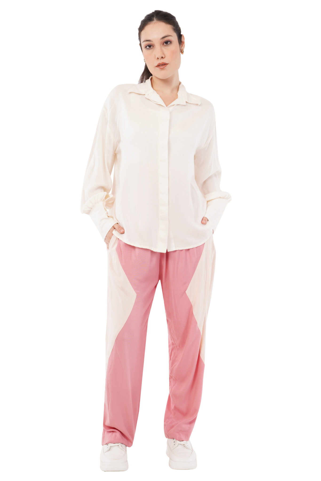 Cream Asymmetric Shirt + Pink Relaxed Trousers