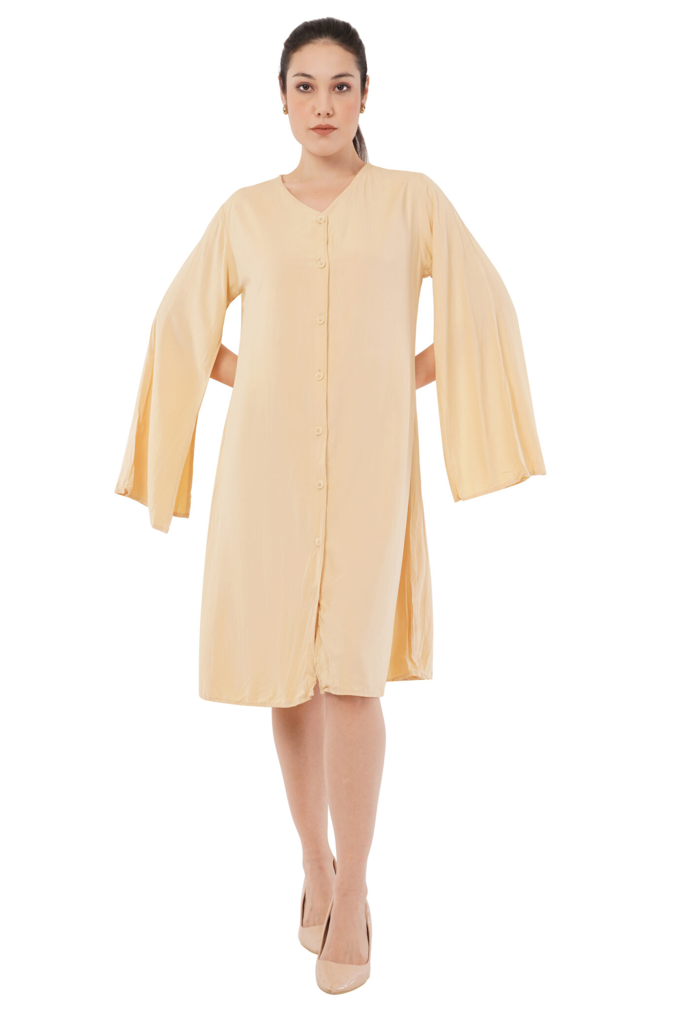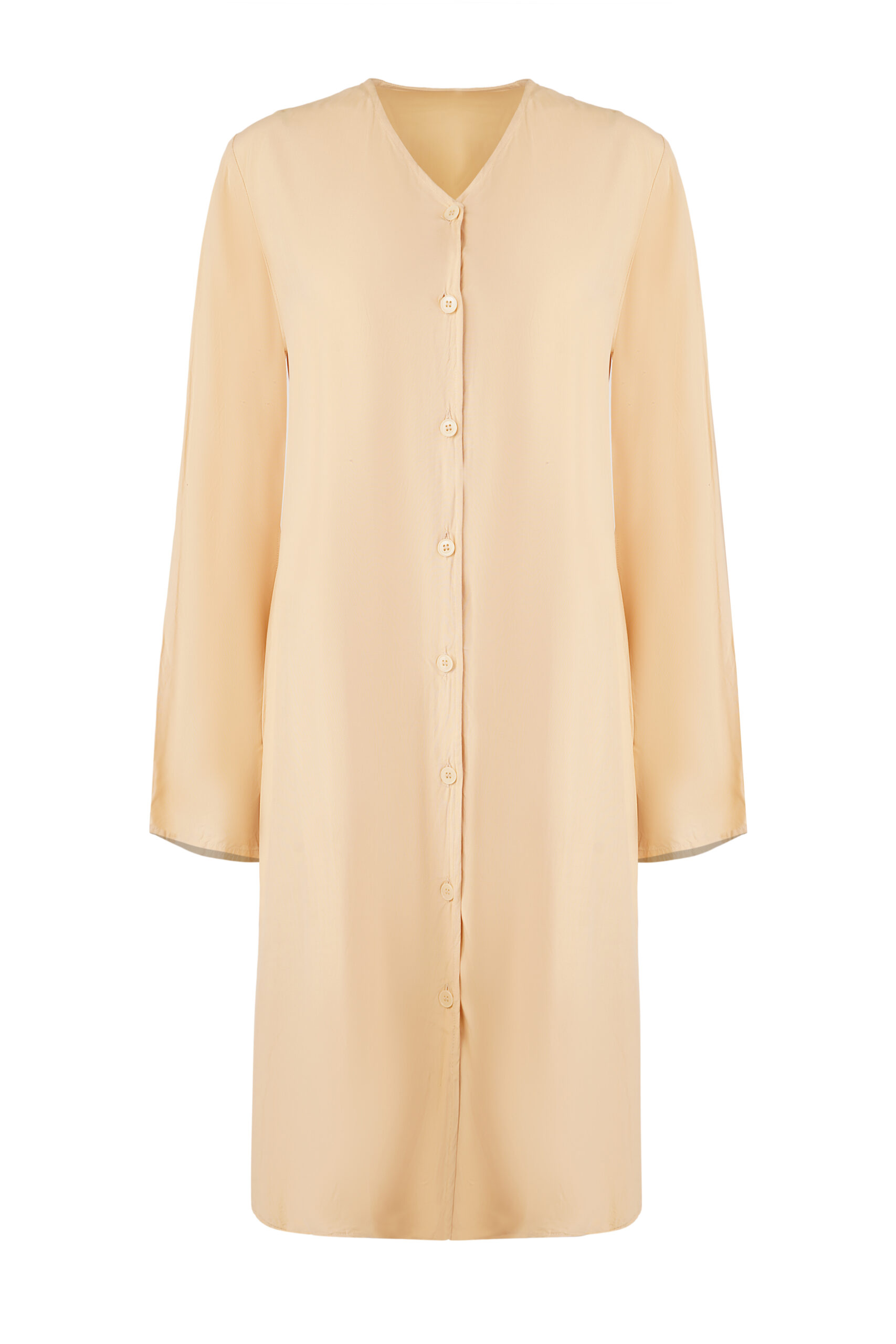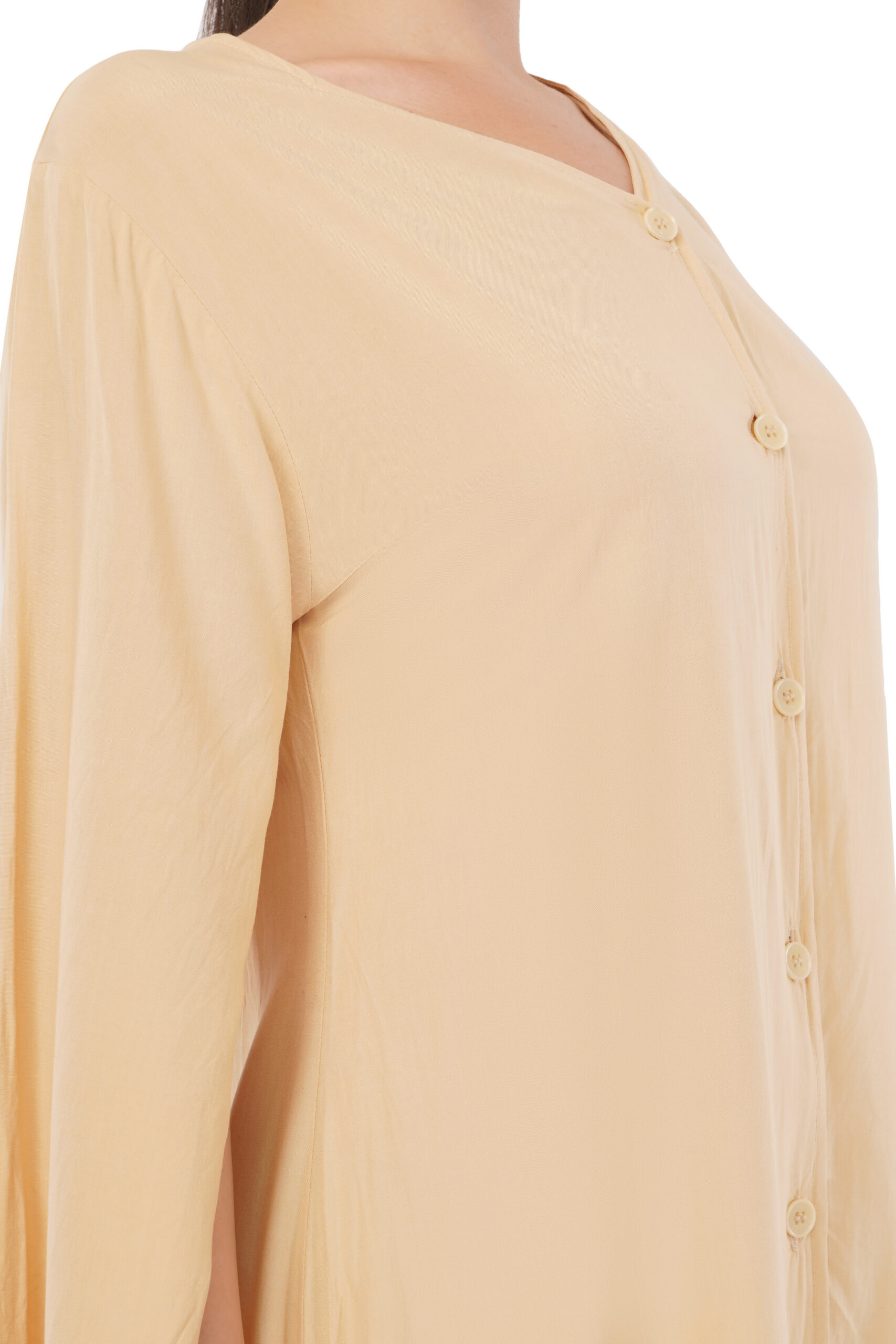 Morning light caught in fabric. This knee-length tunic in saffron carries the warmth of Asian sunrises—a hue that speaks before you enter the room. The V-neckline frames with intention, while a vertical button placket creates clean geometry from collar to hem. Long sleeves end in tailored cuffs, each detail placed with precision that understands a woman’s day doesn’t pause for adjustments.