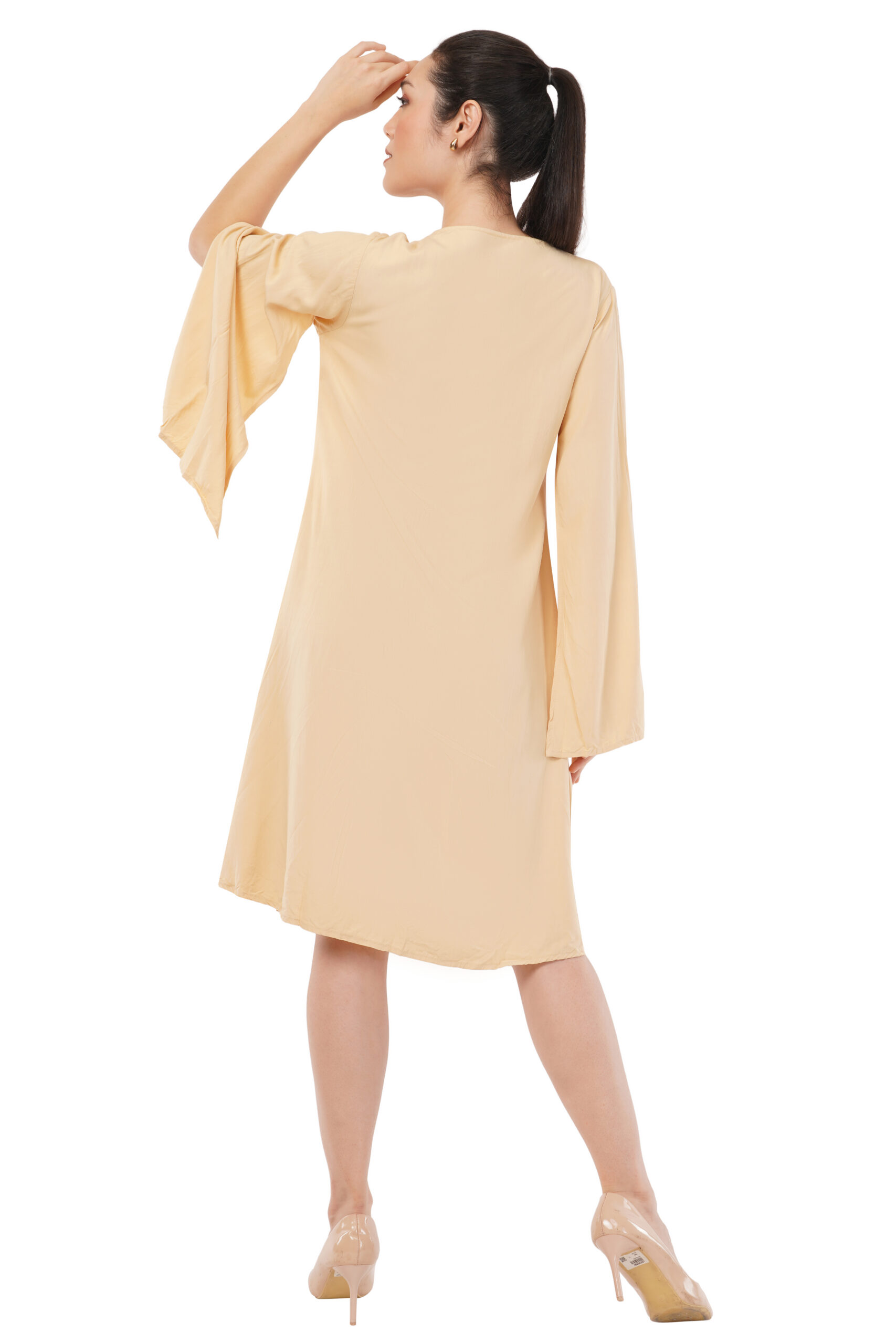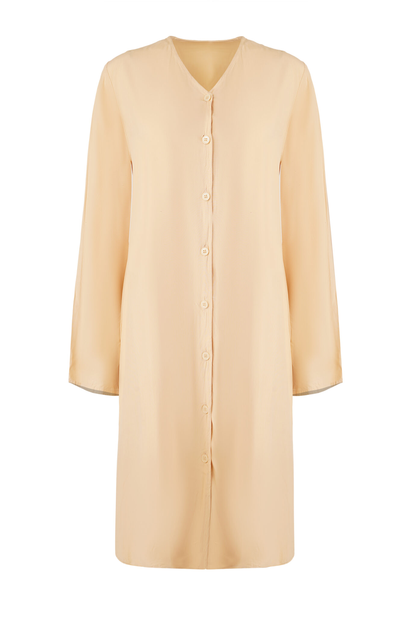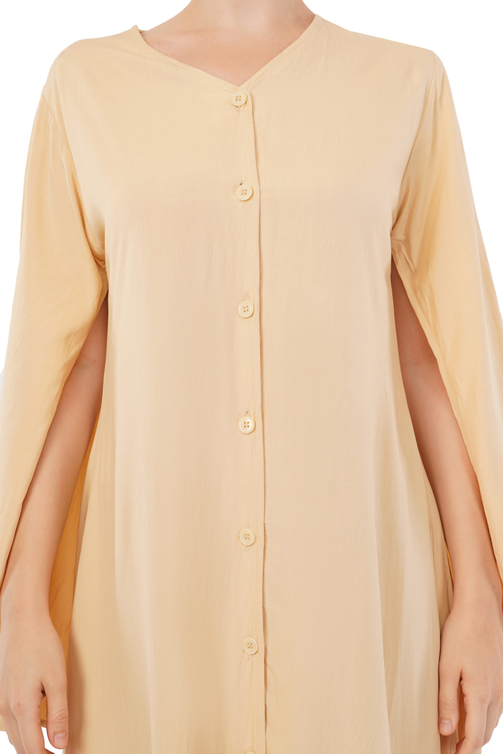Morning light caught in fabric. This knee-length tunic in saffron carries the warmth of Asian sunrises—a hue that speaks before you enter the room. The V-neckline frames with intention, while a vertical button placket creates clean geometry from collar to hem. Long sleeves end in tailored cuffs, each detail placed with precision that understands a woman’s day doesn’t pause for adjustments.