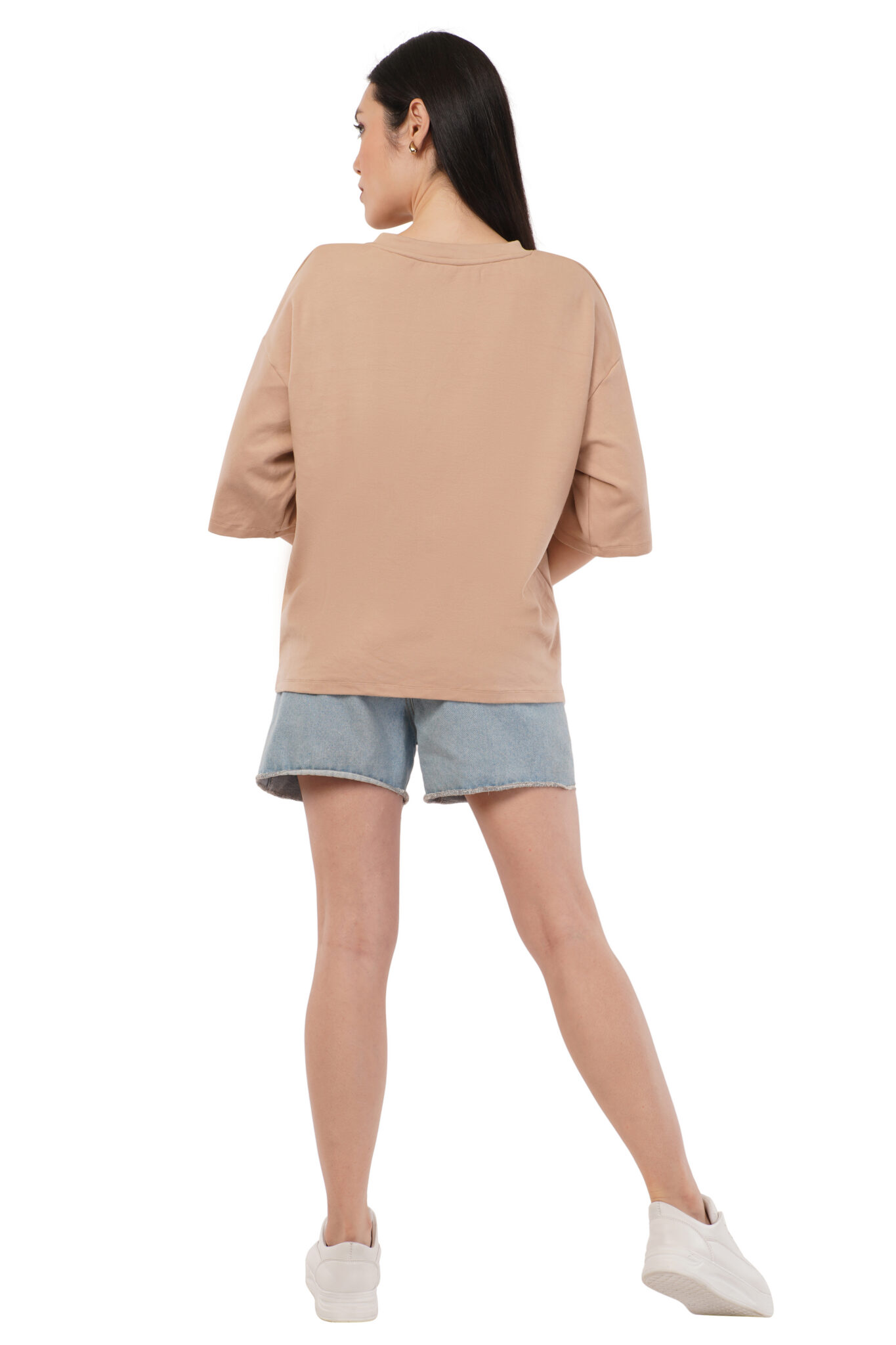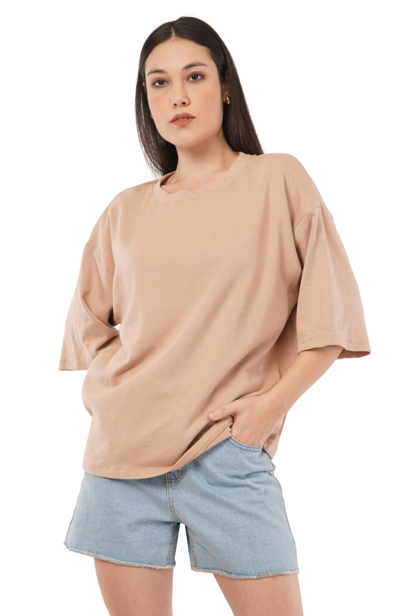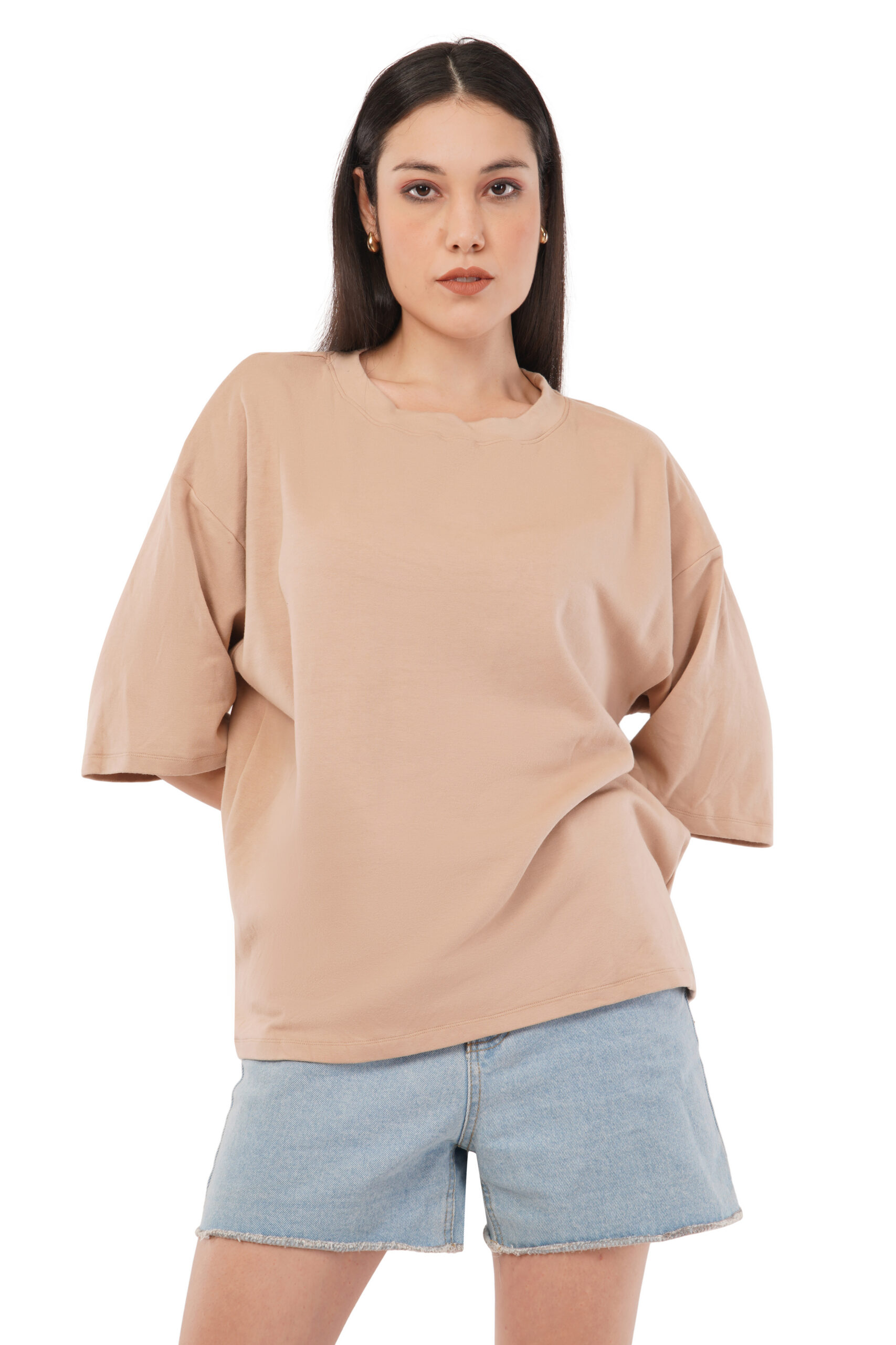 Desert beige oversized tee with crew neckline and elbow-length sleeves—relaxed fit that drapes rather than clings, hem falling to mid-hip. The silhouette is deliberately loose, offering ease without shapelessness. Clean ribbed neckline, simple construction, no unnecessary details competing for attention.