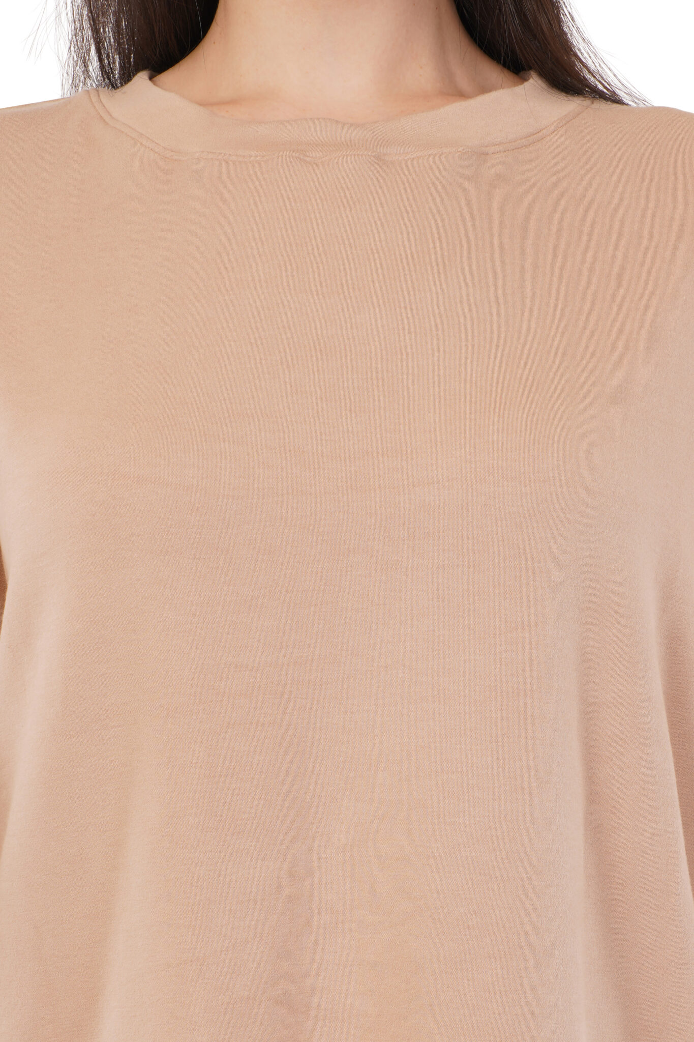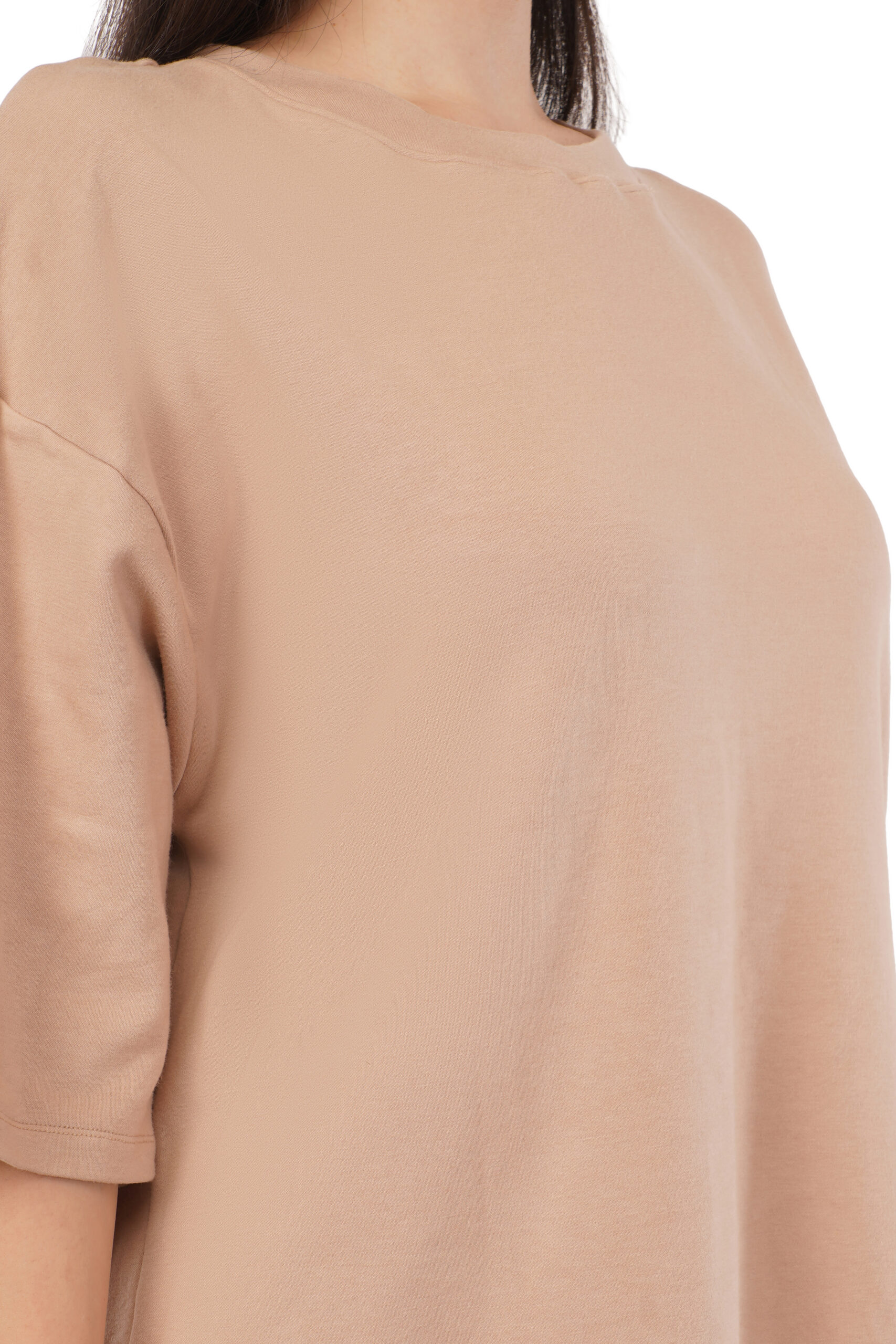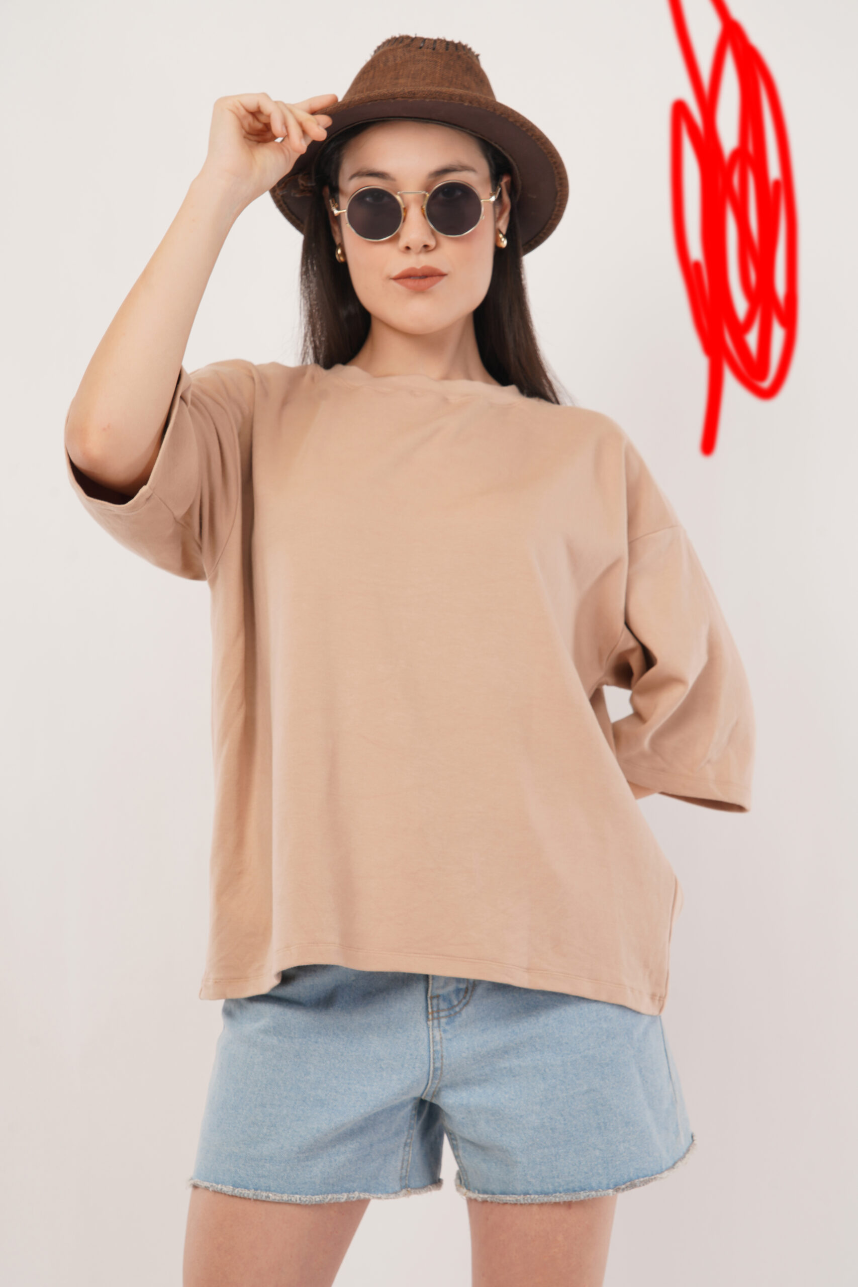 Desert beige oversized tee with crew neckline and elbow-length sleeves—relaxed fit that drapes rather than clings, hem falling to mid-hip. The silhouette is deliberately loose, offering ease without shapelessness. Clean ribbed neckline, simple construction, no unnecessary details competing for attention.