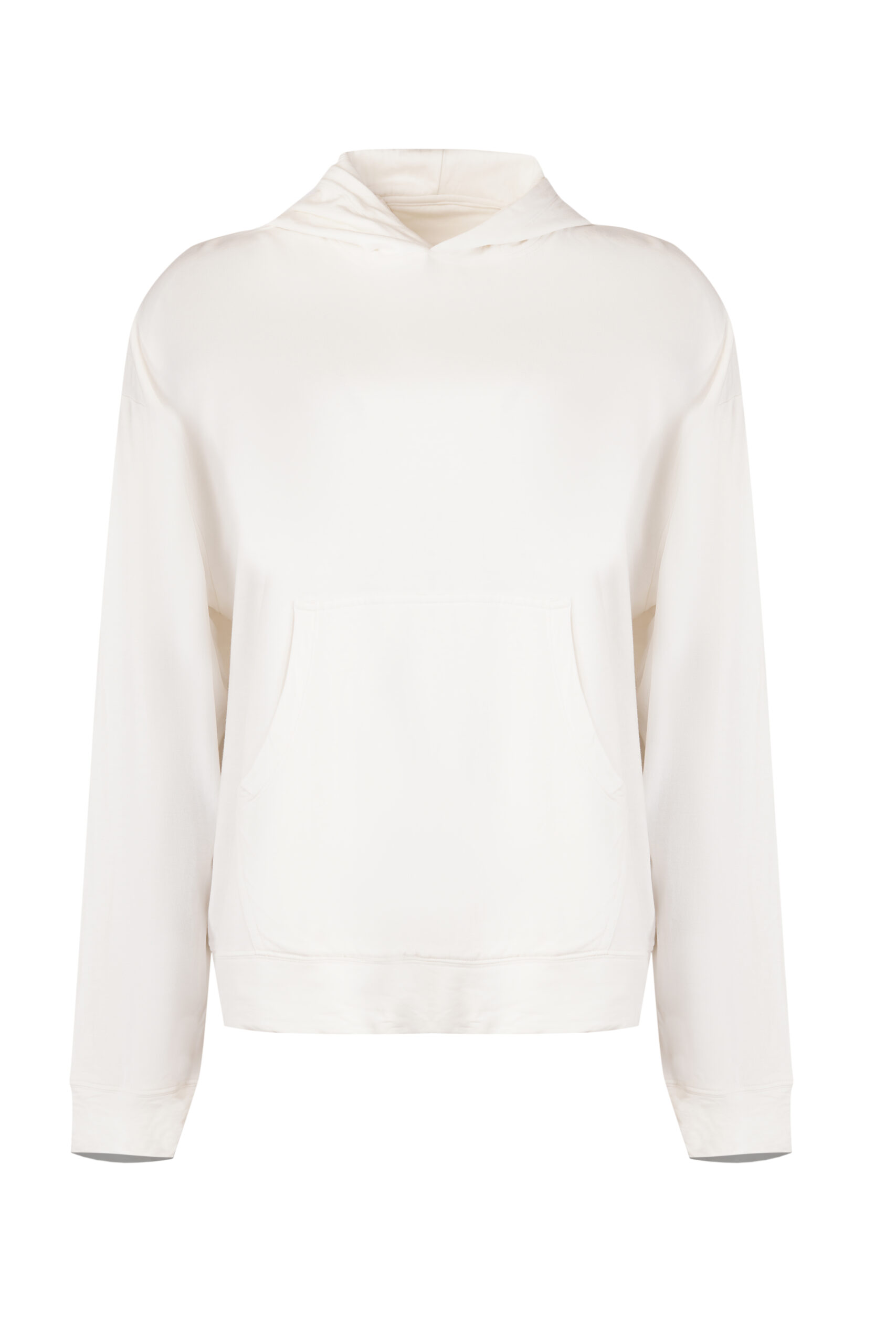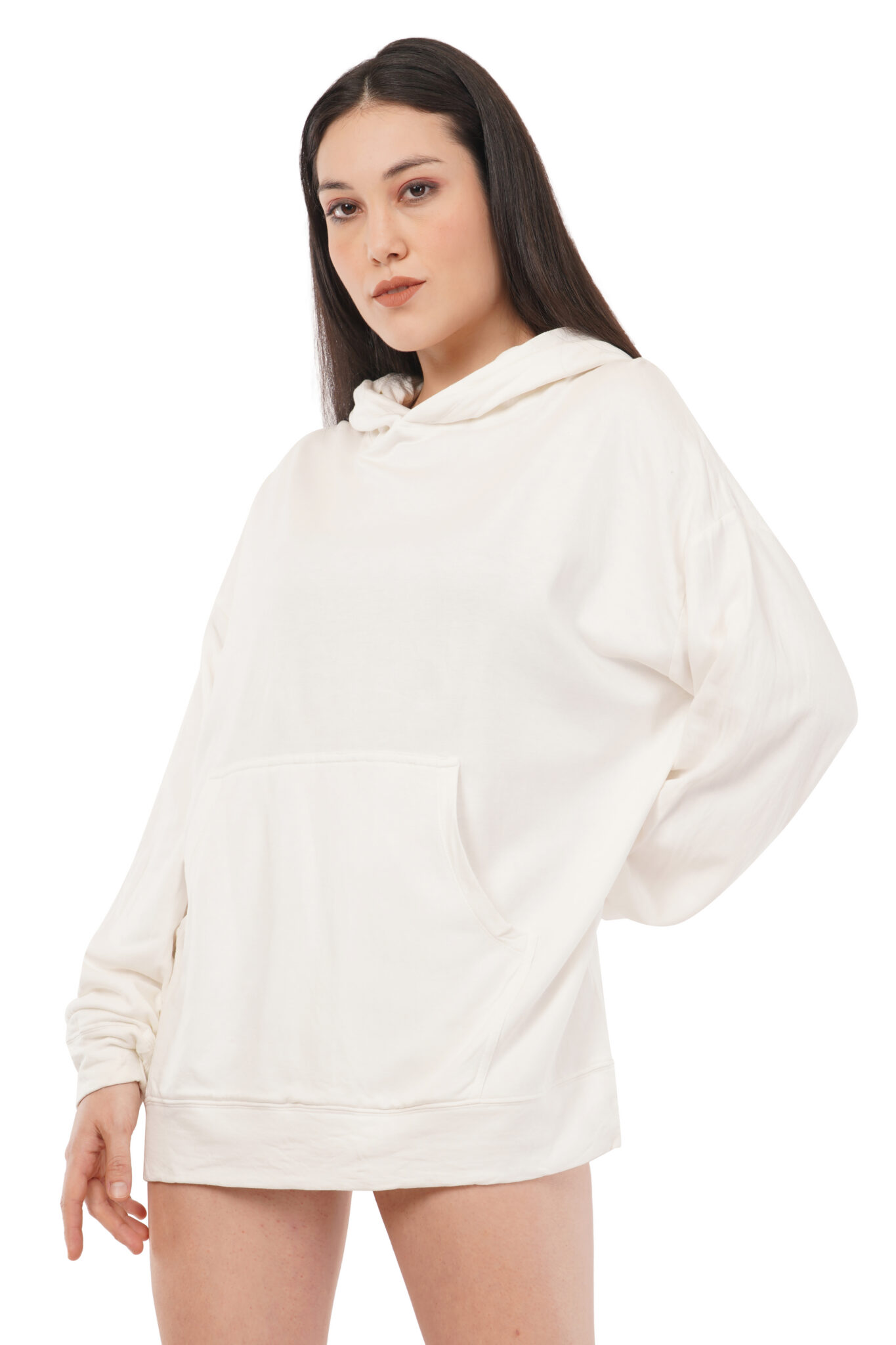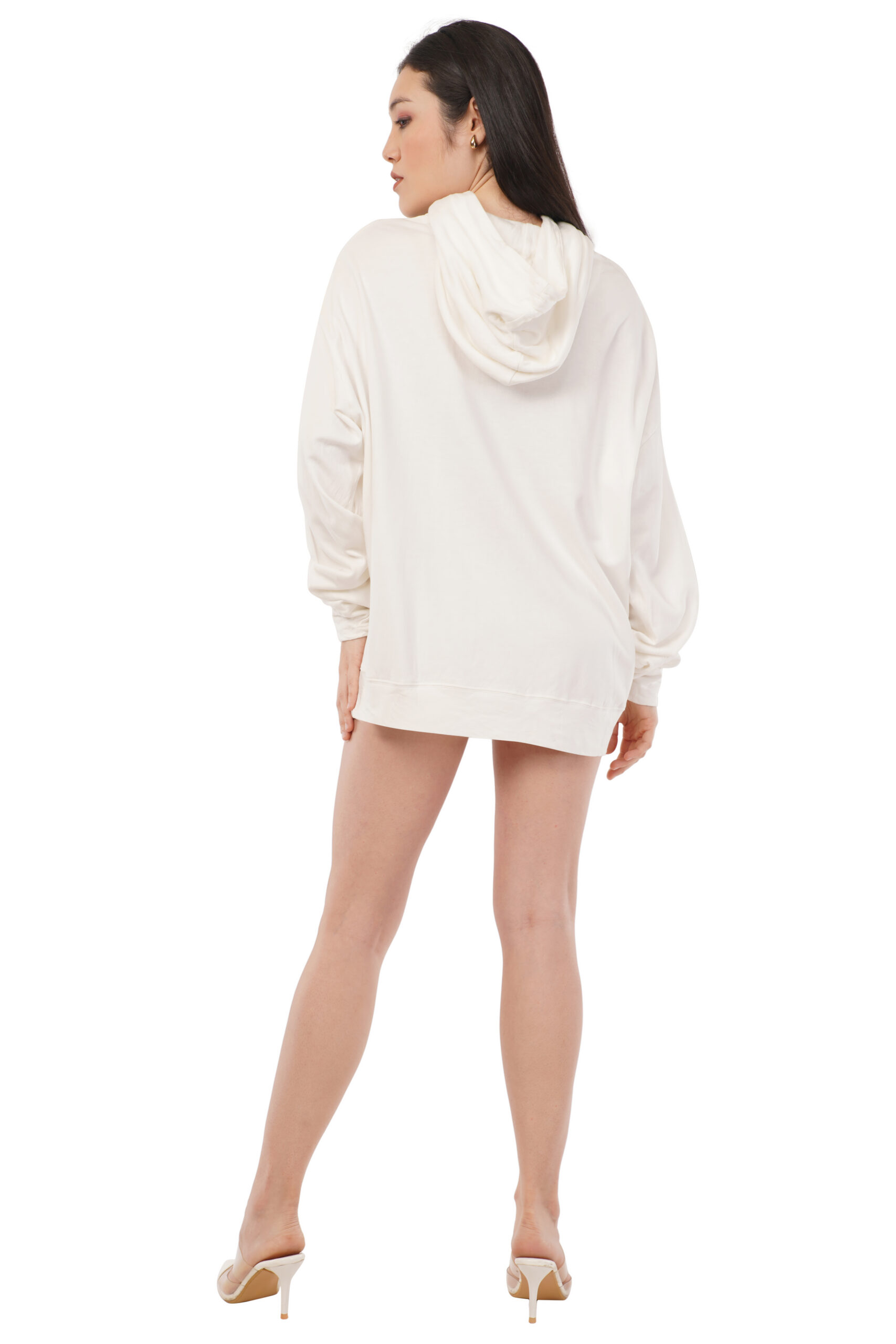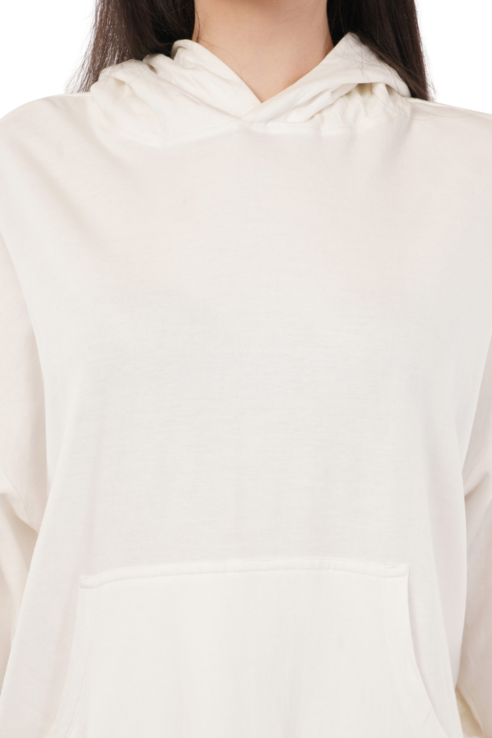 Foundational luxury. Ivory hoodie with clean lines, kangaroo pocket, relaxed hood that frames without overwhelming. Long sleeves, comfortable through the body without excess volume. This is the piece that proves essential doesn’t mean ordinary—it means indispensable.