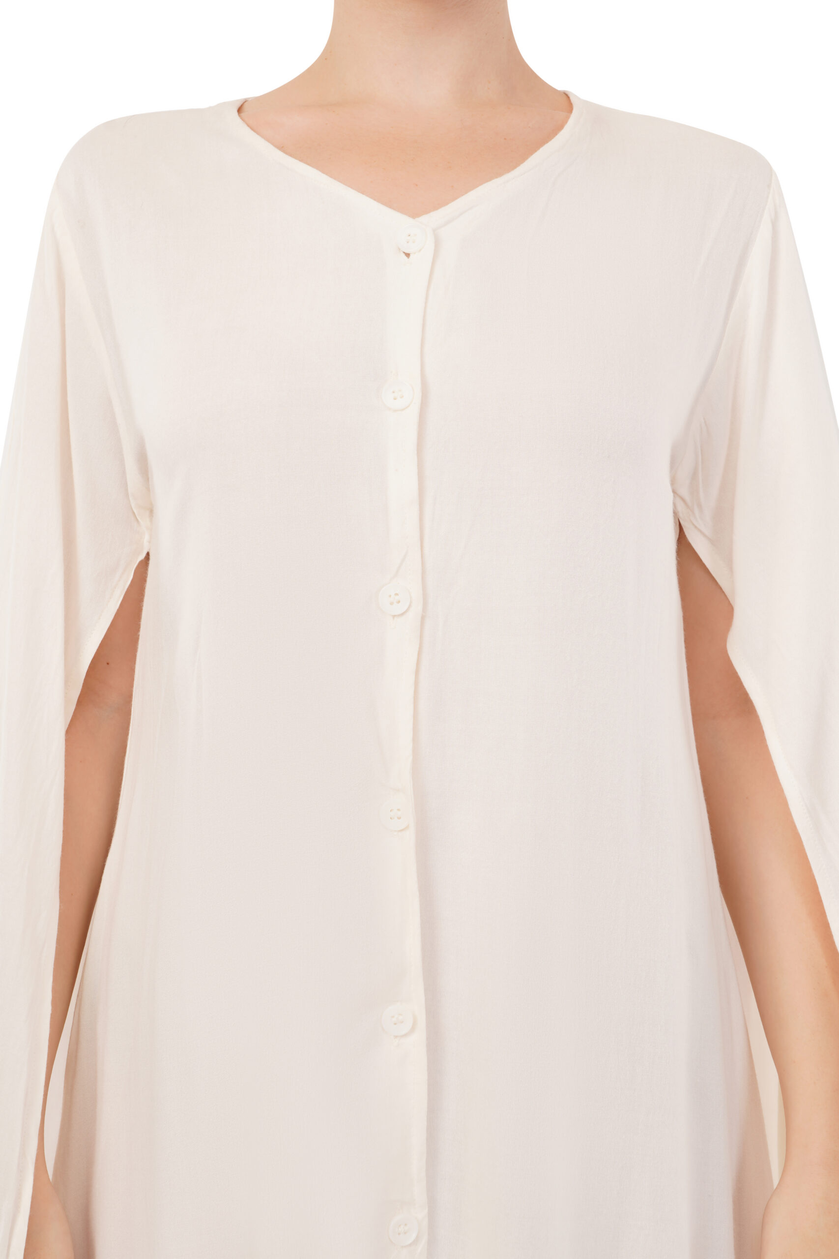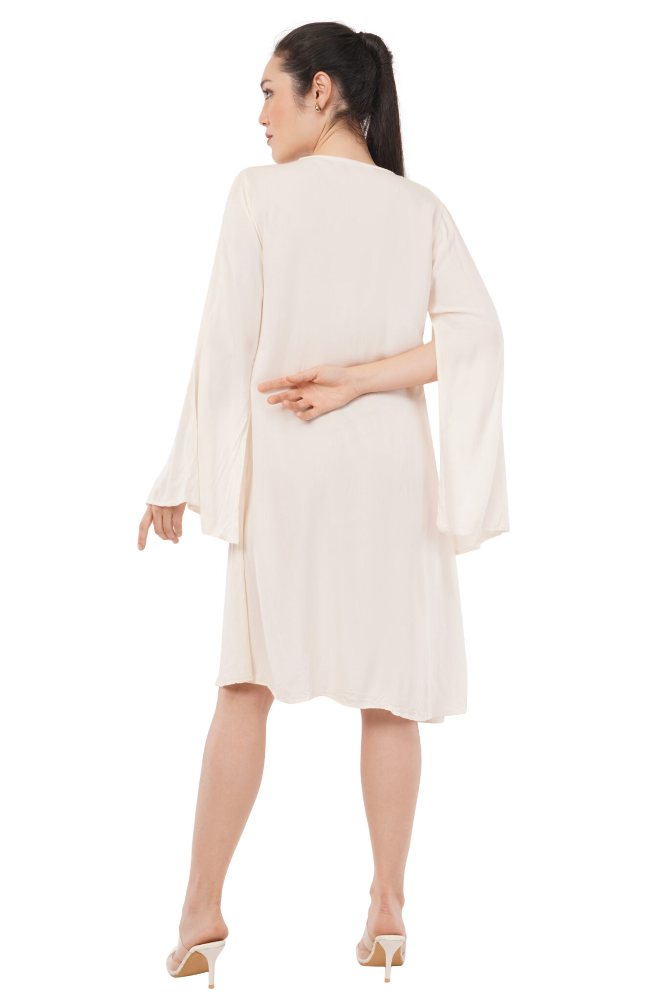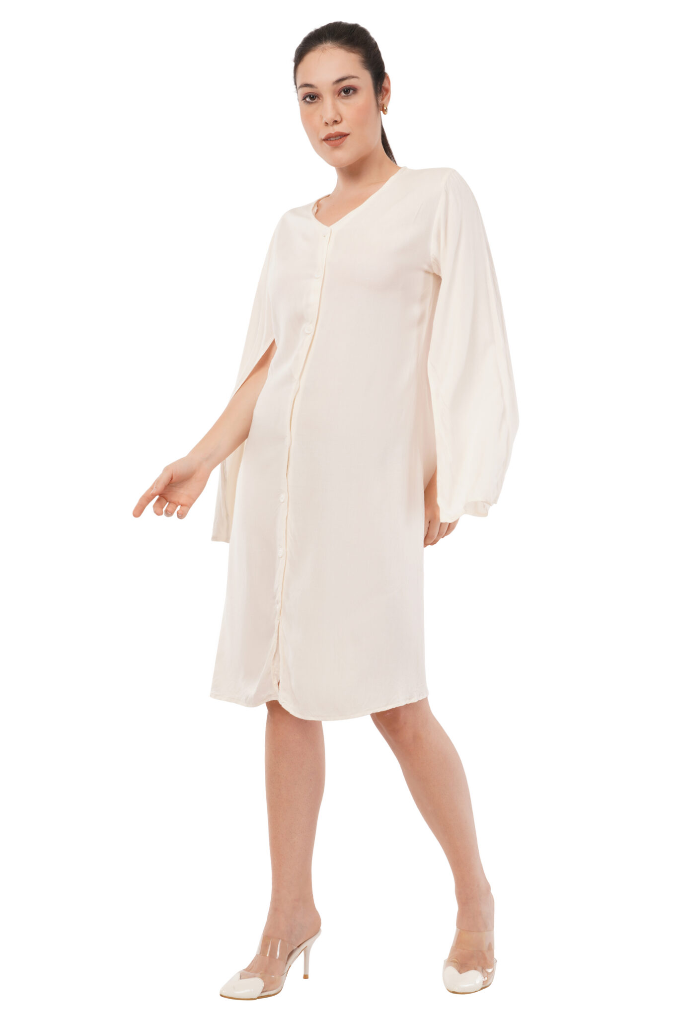 Pure as intention. Ivory tunic dress in knee-length—the shade that holds all possibilities before decision. V-neckline creates soft geometry at collarbone, while vertical button placket runs clean from throat to hem. Long sleeves with gentle taper, each button placed with the understanding that closure can be elegant when it serves purpose rather than decoration.