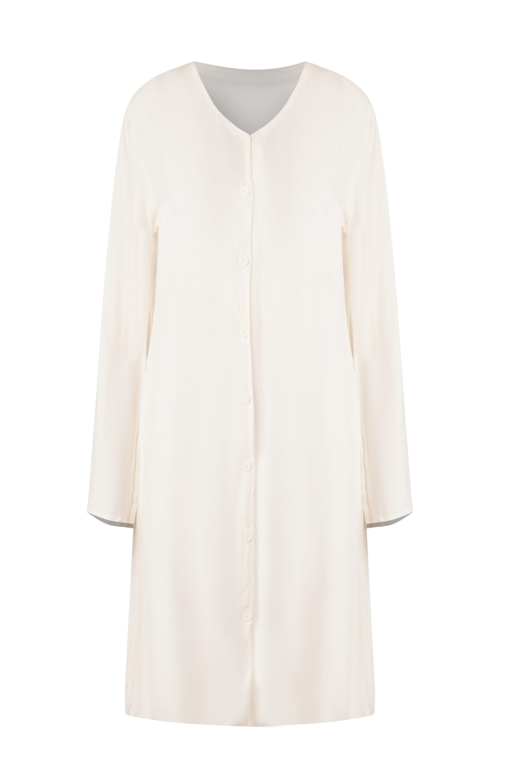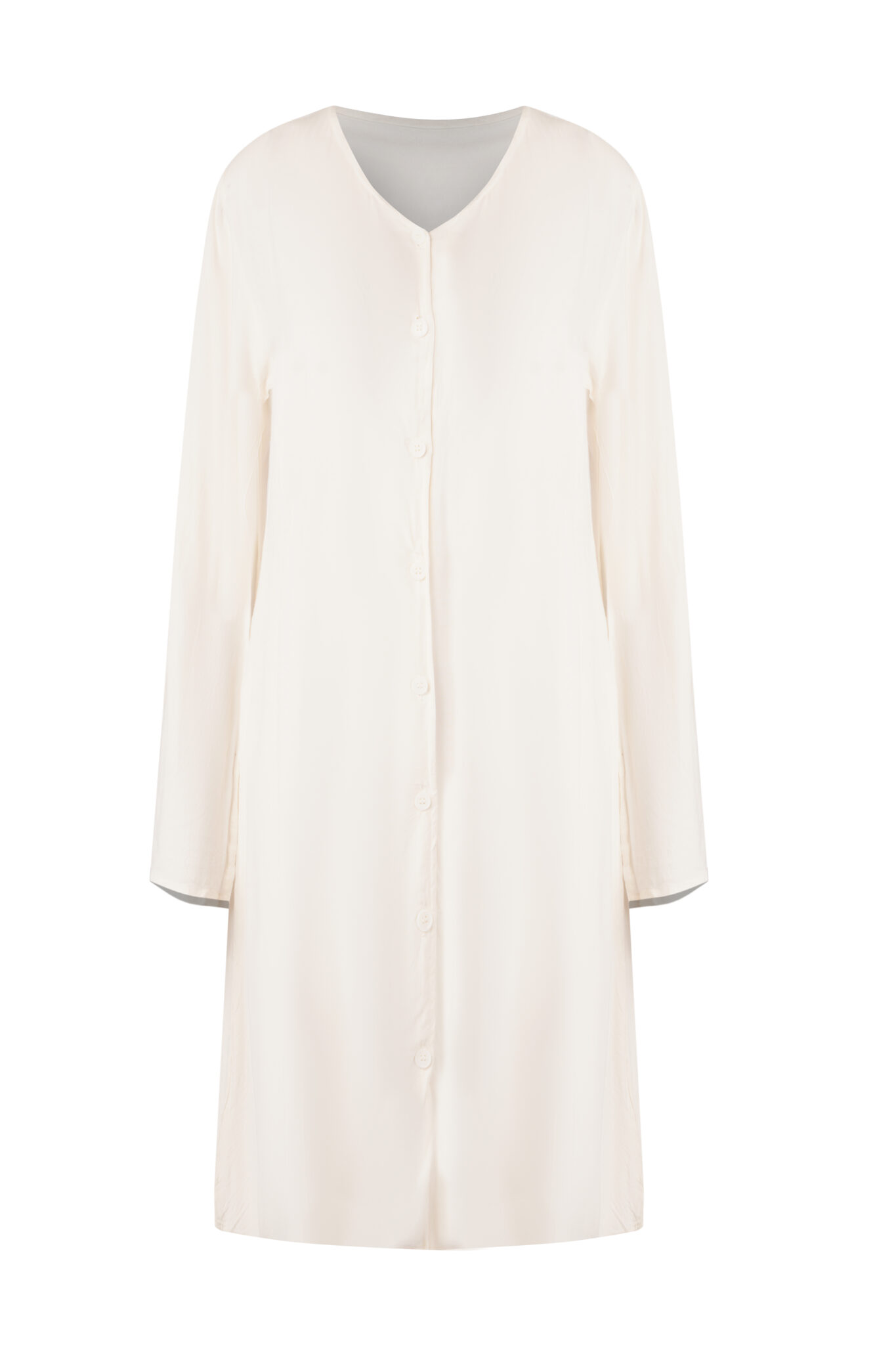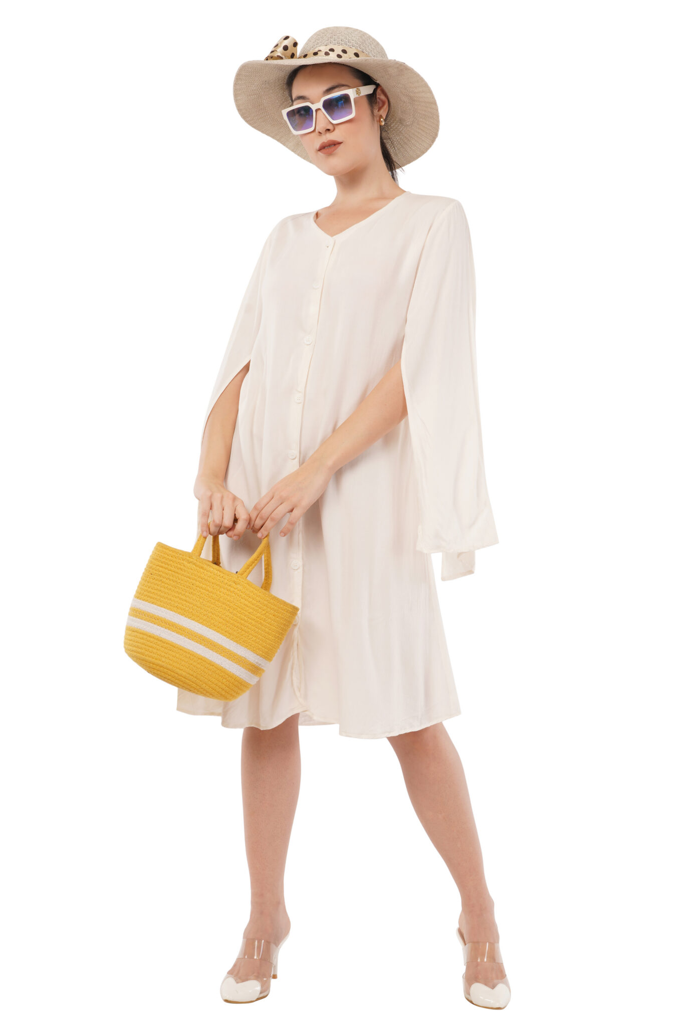 Pure as intention. Ivory tunic dress in knee-length—the shade that holds all possibilities before decision. V-neckline creates soft geometry at collarbone, while vertical button placket runs clean from throat to hem. Long sleeves with gentle taper, each button placed with the understanding that closure can be elegant when it serves purpose rather than decoration.