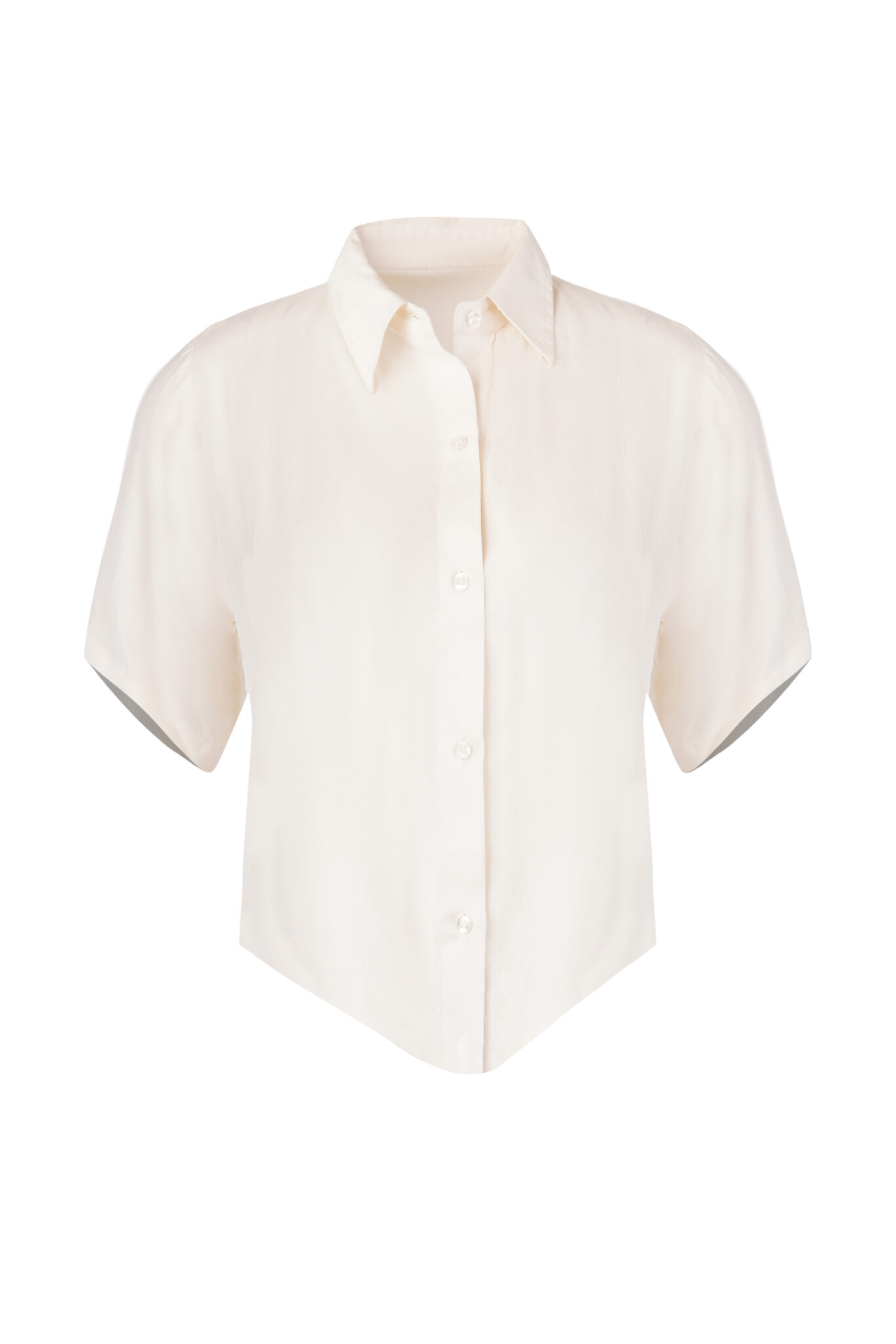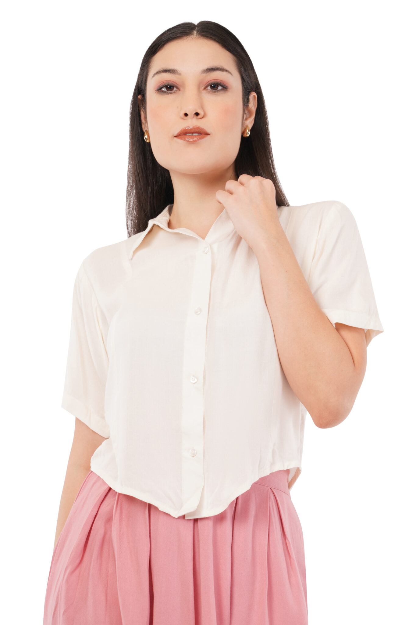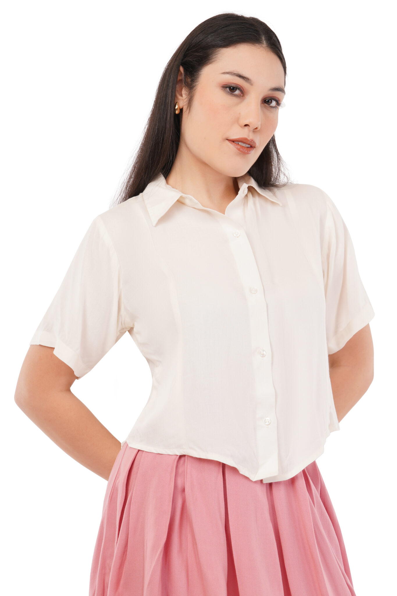 Geometry in pearl. This short-sleeve button shirt features pointed hem creating angular interest at the waist—the front and back panels come to subtle points rather than straight edges. Classic pointed collar, clean button placket, sleeves that end with deliberate structure. The pearl shade sits between cream and white, offering neutrality with warmth.