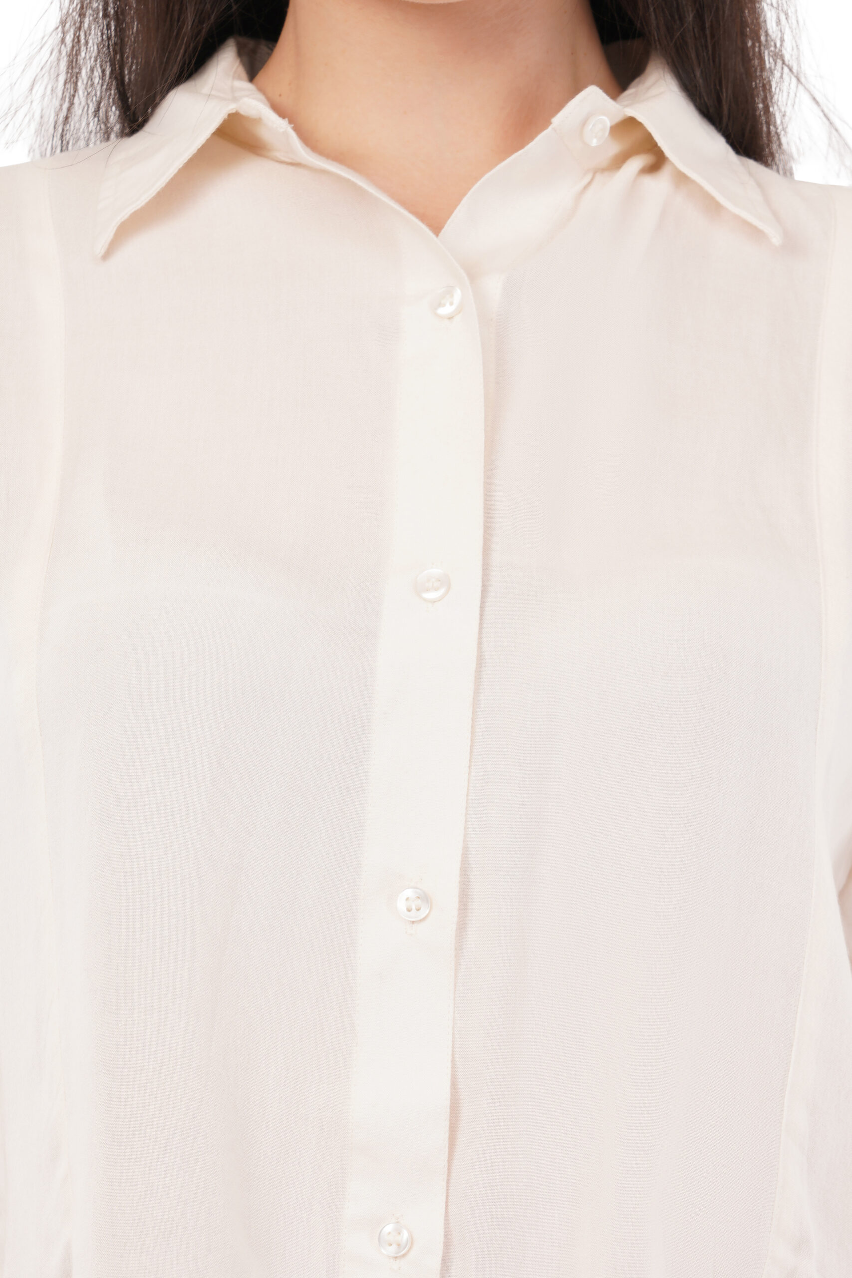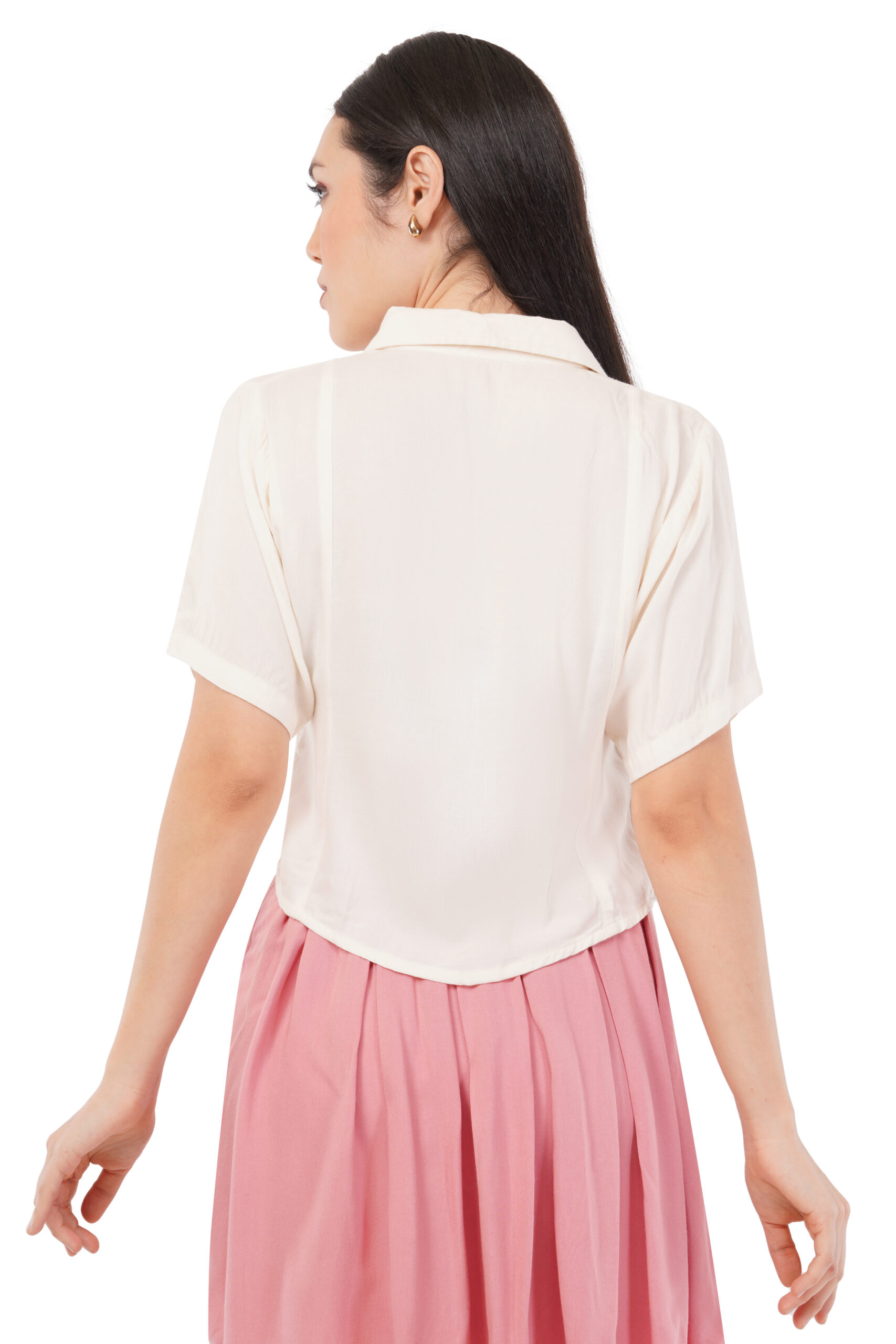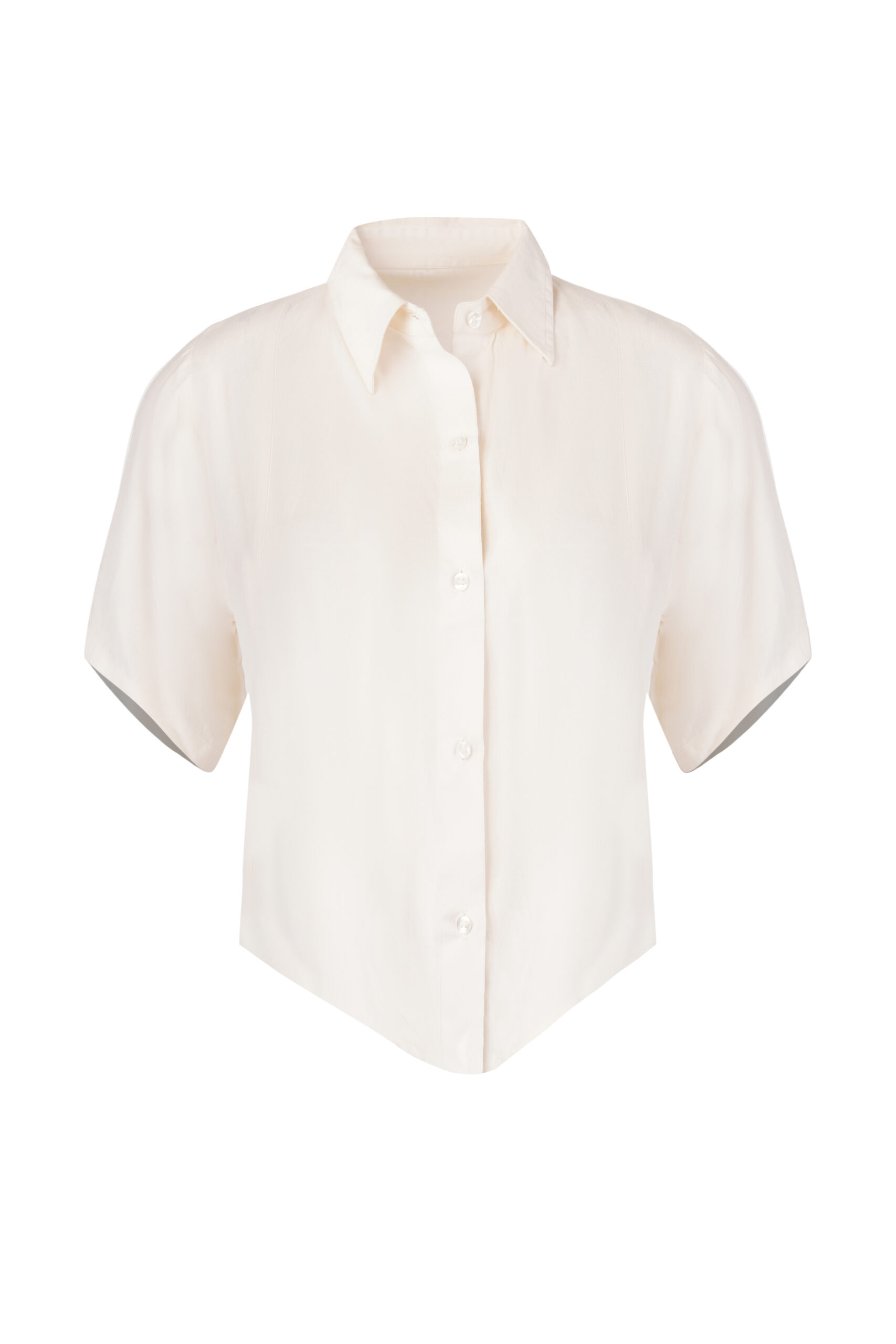 Geometry in pearl. This short-sleeve button shirt features pointed hem creating angular interest at the waist—the front and back panels come to subtle points rather than straight edges. Classic pointed collar, clean button placket, sleeves that end with deliberate structure. The pearl shade sits between cream and white, offering neutrality with warmth.