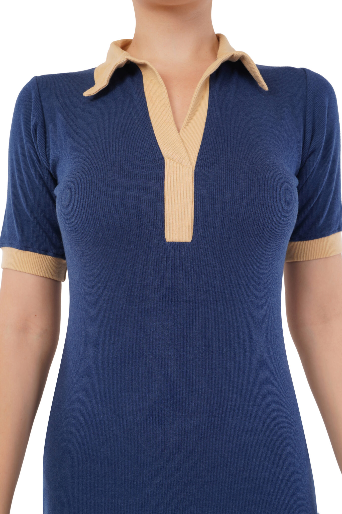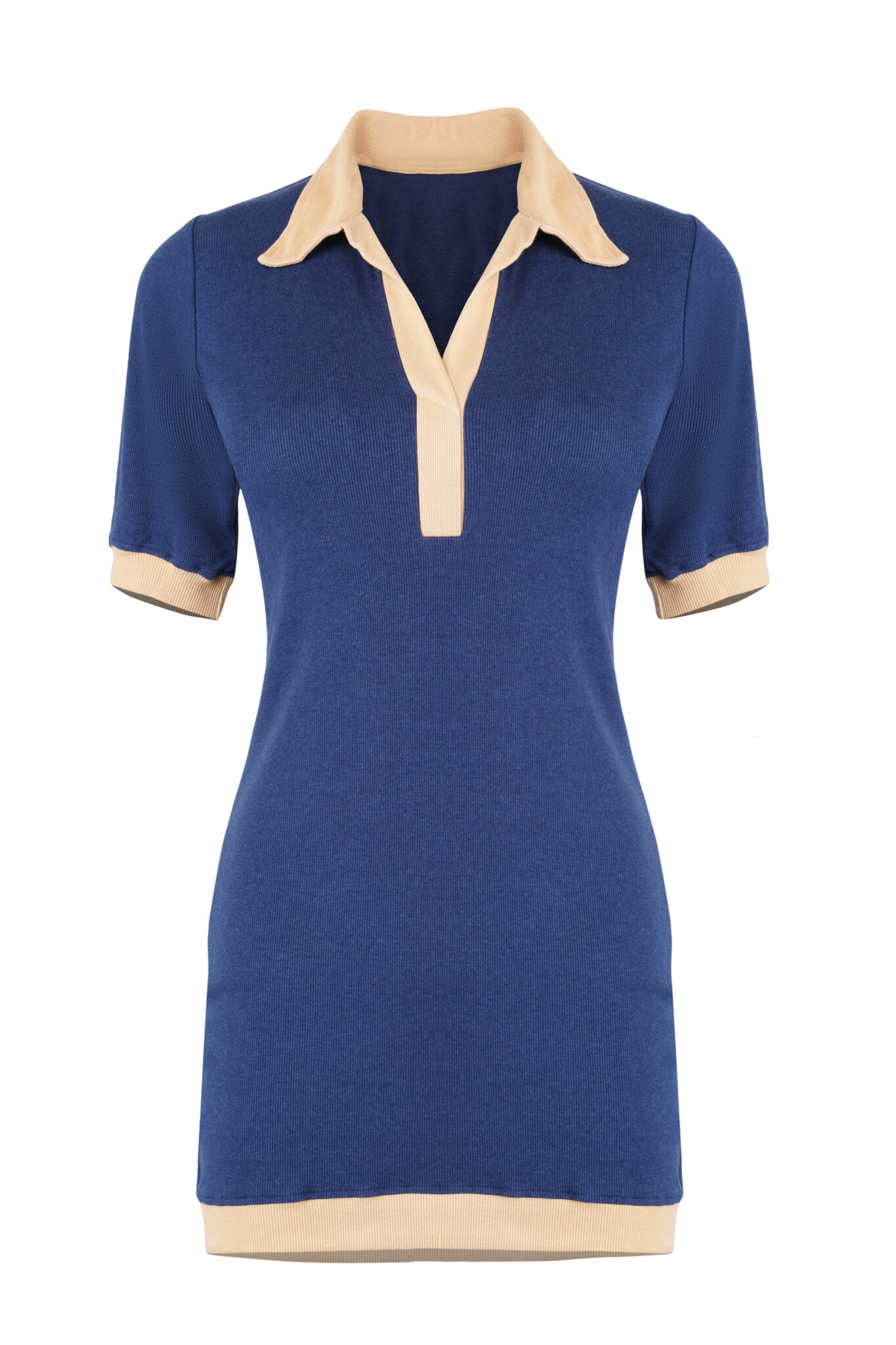 Sapphire navy body with honeygold collar, placket, sleeve cuffs, and hem binding—color conversation as design strategy. Polo-style collar in honeygold, short sleeves with honeygold cuffs, mini length with honeygold binding at hem. The ribbed texture throughout adds dimension, while the contrast trim creates architectural definition.