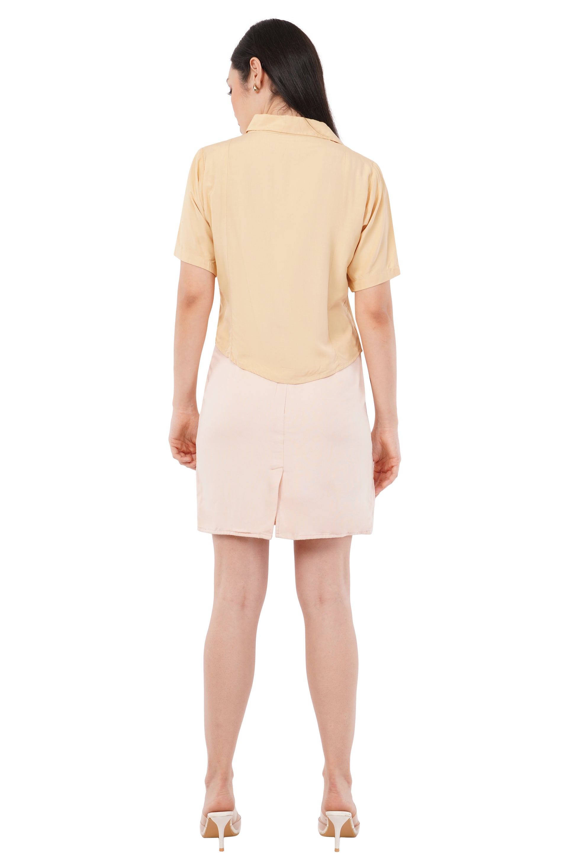 Relaxed refinement for the contemporary woman. Our oversized peach shirt brings an ease that whispers rather than shouts wealth, paired with the tailored precision of our cream mini skirt. The natural biodegradability of bamboo means you're investing in pieces that respect both your skin and the planet. Bamboo's inherent softness only improves with washing—these are pieces that get better with time, much like the woman who wears them.